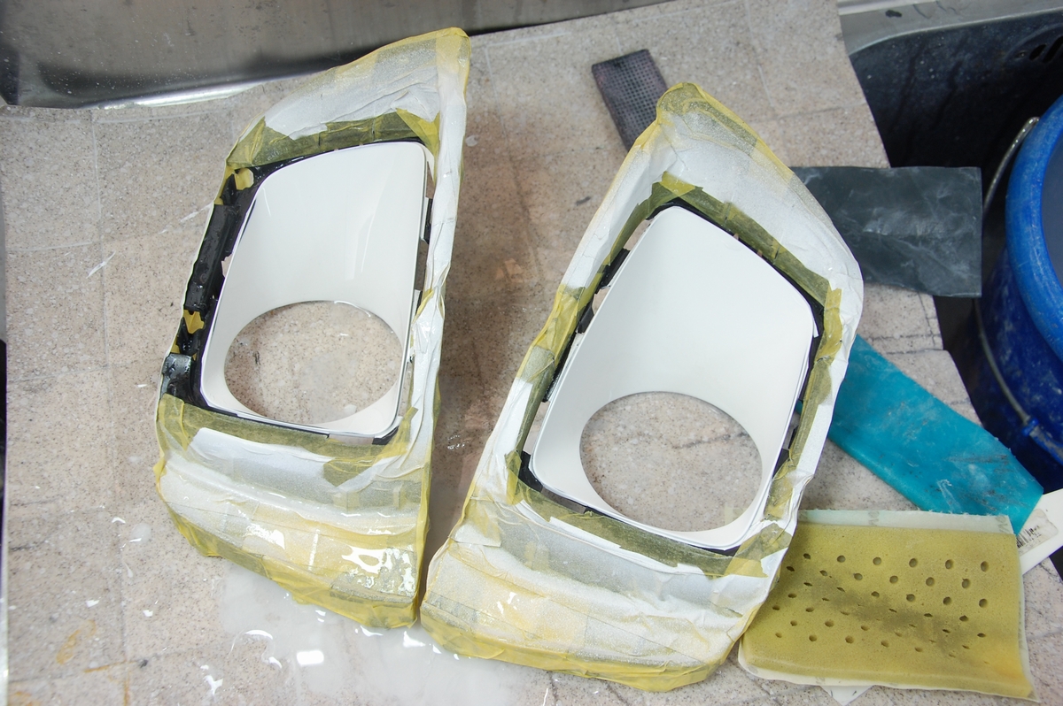 エンブレム左右にあるモールパネルは元々クリスタルブラックシリカっぽい艶あり仕上げに塗装されていましたが、肌が悪かったという事もあり、今回新たに塗り直しています。