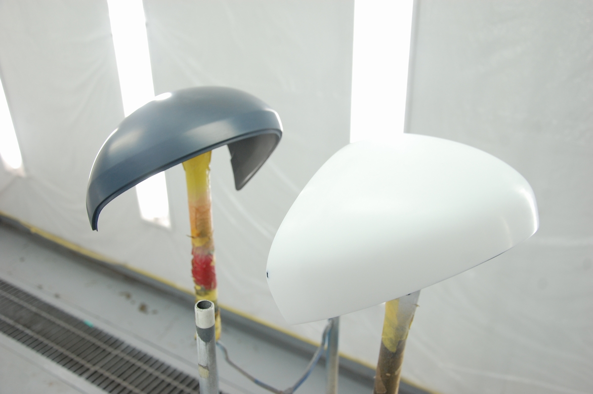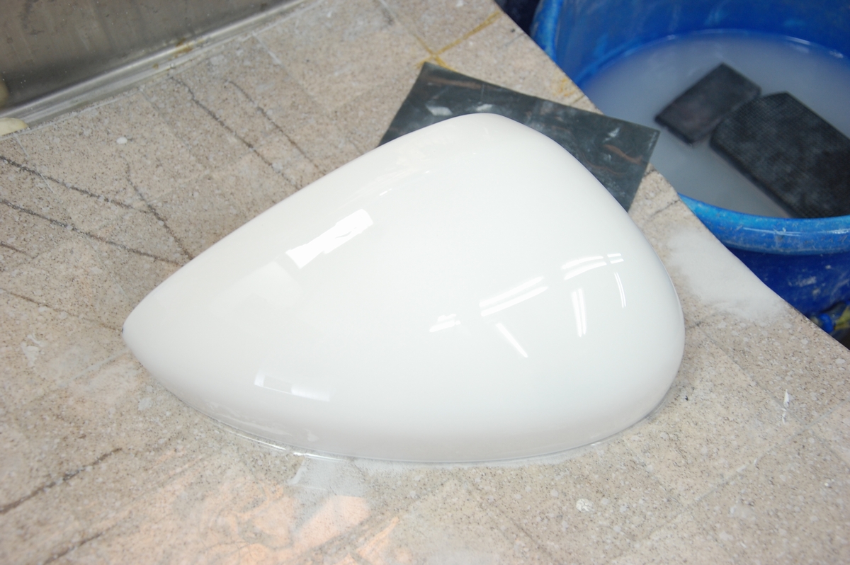 対して右側のミラーカバーは傷の無い状態なので、足付け処理だけしてそのまま上塗りが可能となります。もし右側のような新品のミラーカバーが1万円以下で買えるなら、左側も新しい物に交換した方がトータルでは安価で済む筈で、ただ実際はそんなに安くはないので直して使っているという訳ですね。日本車の場合はさらにカラード製品(ボディカラー塗装済み品)の設定があるので、そもそも塗り直すより交換した方が安いし早い!となる訳ですね。