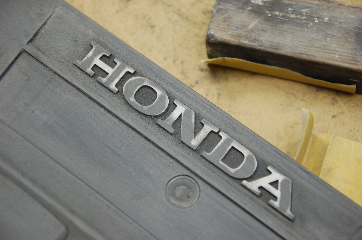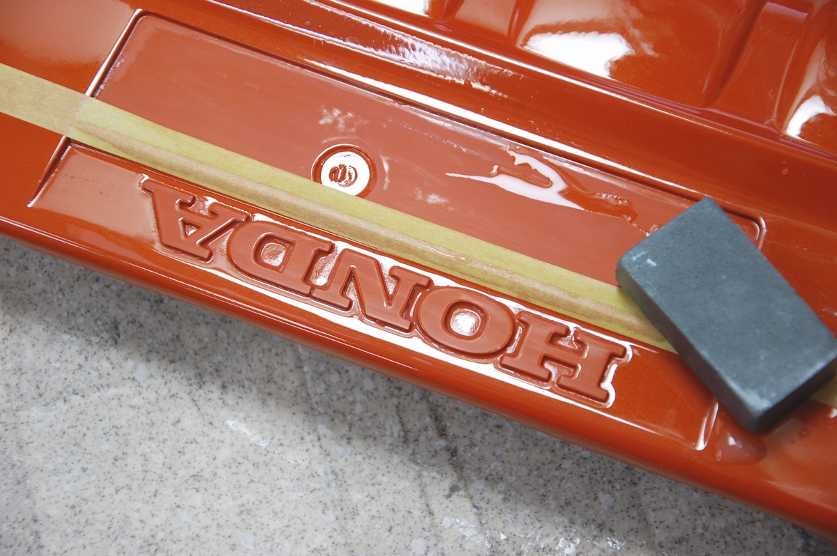 HONDAの凸文字周りは隙間が非常に狭く、いつも行っているGT-Rタイミングベルトカバーの時のように当て板を使って研ぎを行うのは難しいですから、ここはサフェでは無くトップコート(下塗り)のレベリングを利用した2度塗りで対応しています。