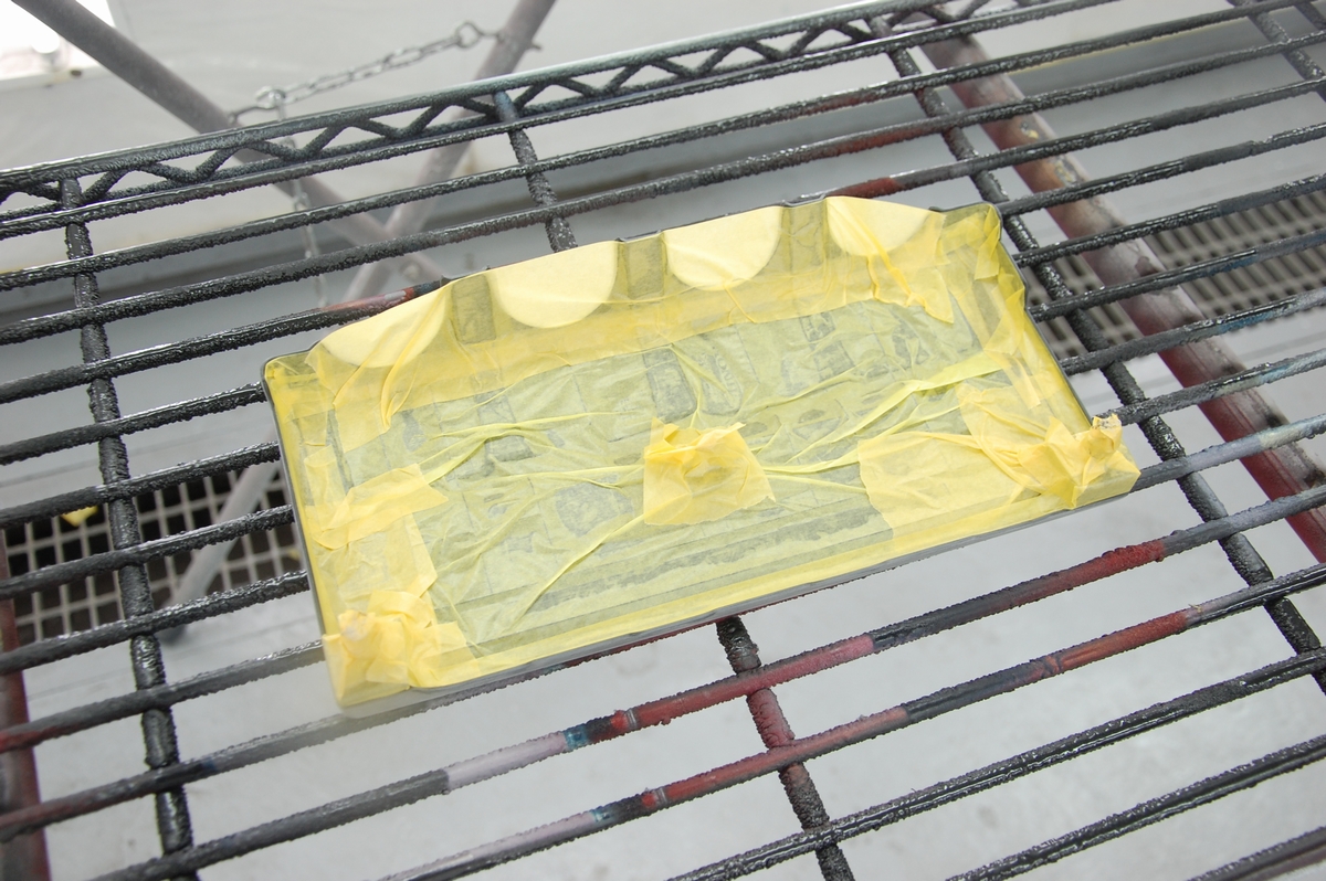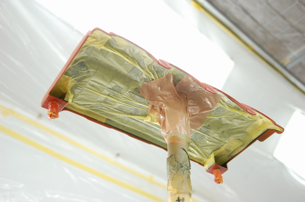 「研磨→プライマー塗布→サーフェサー塗布→完全硬化→研磨」と下塗りを行い、