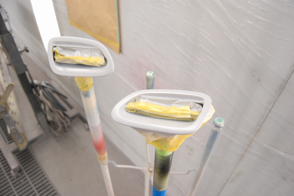 またきわどいマスキングの場合は「塗ったら直ぐに剥がす」が基本で、ただしこの状態で他の物を塗るとスプレーミストがハンドルの皮部分に掛かってしまうのでこのハンドルは最後に塗るようにします。で、塗り終わってスプレーガンを置いたら本当に直ぐ(5秒くらい)でマスキングテープを剥がし始めます。少々リスキーですがそれくらいしないとブツ切りのマスキングは綺麗に仕上がらないんですよね。