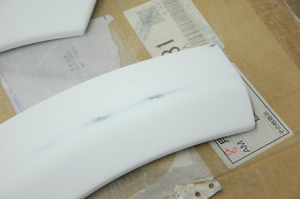 BMW等の社外品(M等)で同じような軟質PU素材のパーツ=フロントリップスポイラーやサイドステップ、リヤスポイラー等の施工経験はありますが、今まで塗って来たそれらはある程度しっかりした厚みがあるので片手で持っても大きく変形するような事は無かったのですが、今回程のフニャフニャ素材は今までに経験が無く、ある意味新しいチャレンジでもありました。