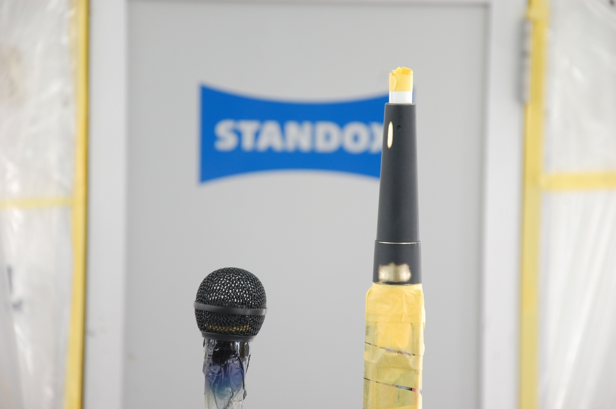 続けて下色に隠蔽力の高いシルバーを塗ります。目の細かいシルバー原色(例えばSTANDOX MIX595または594)をそのまま使っても良いのですが、汎用的に使えるという事でVW社のリフレックスシルバー(LA7W)を採用しています。