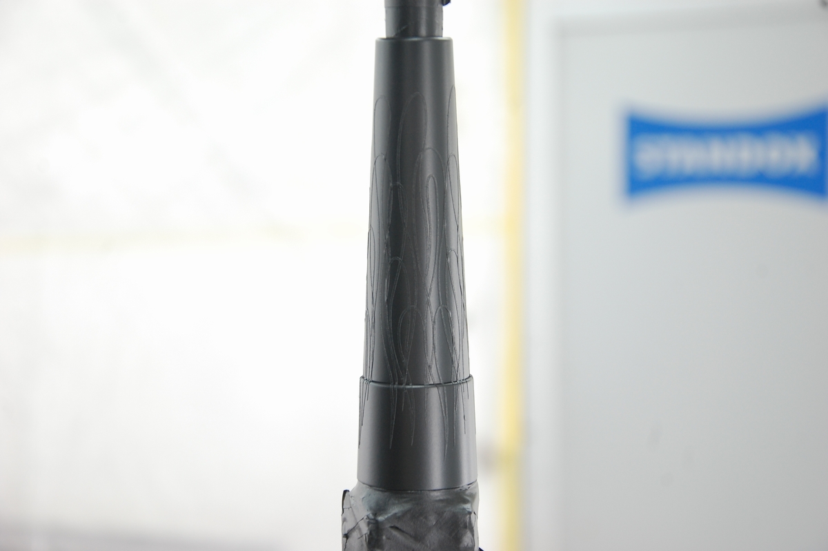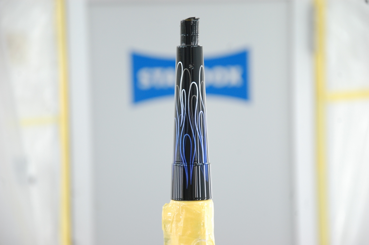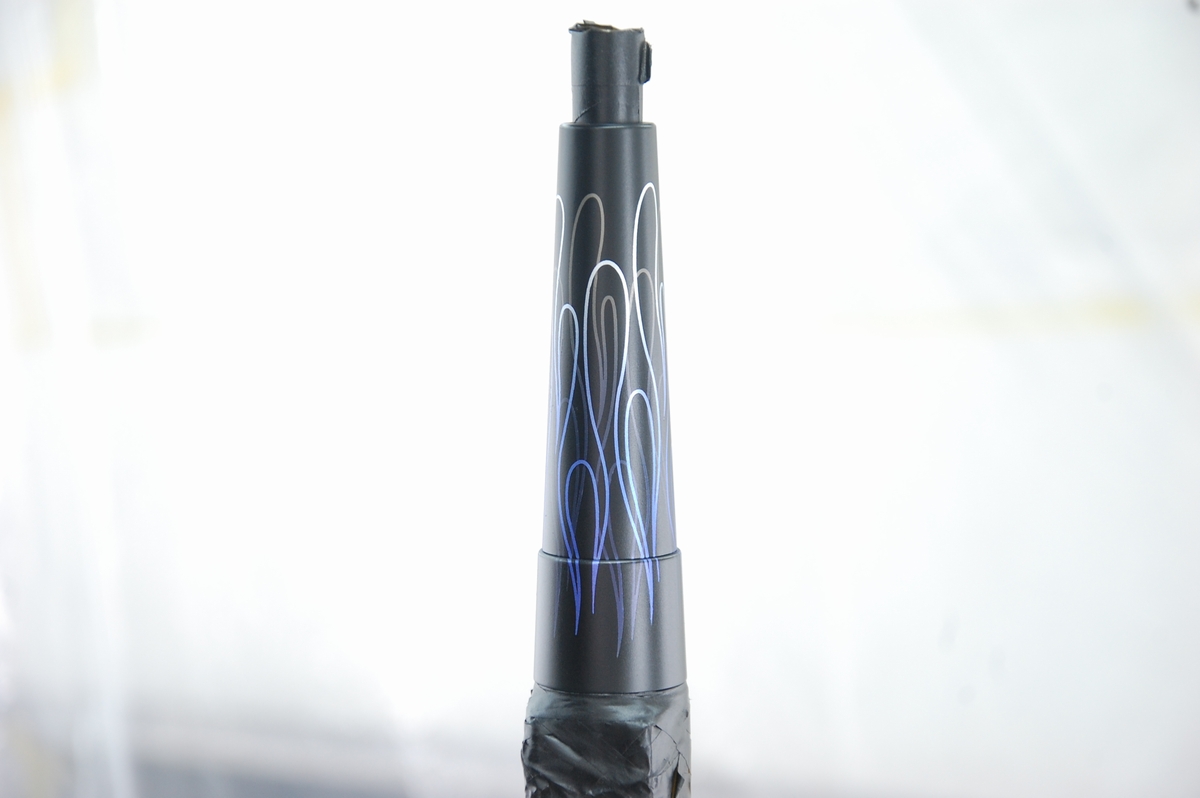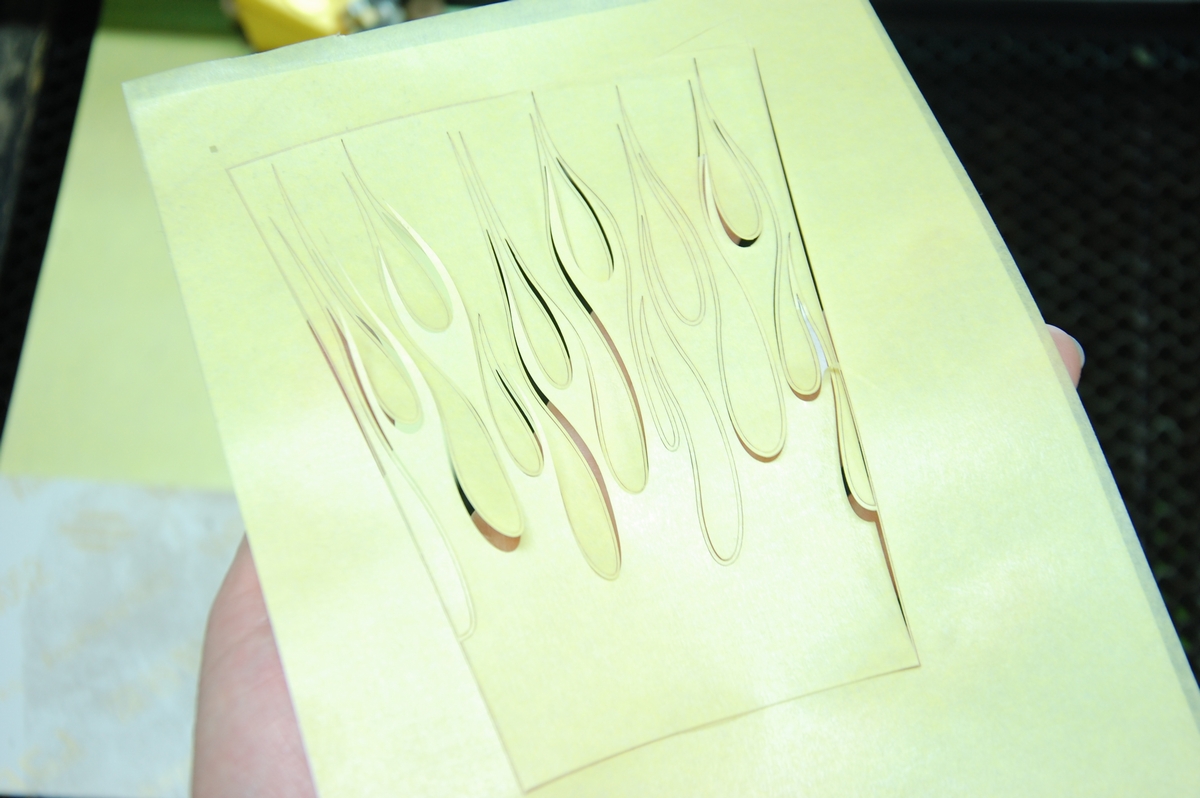 続けて2層目のファイアーパターンを貼ります。転写シートから貼った際は段差部分は浮いていて、その部分だけを押し込もうとするとマスキングが切れてしまいますから、一旦端から剥がし、谷の部分にしっかり押し込んだ後に再び貼り戻します。かなりデリケート且つ面倒な作業です。