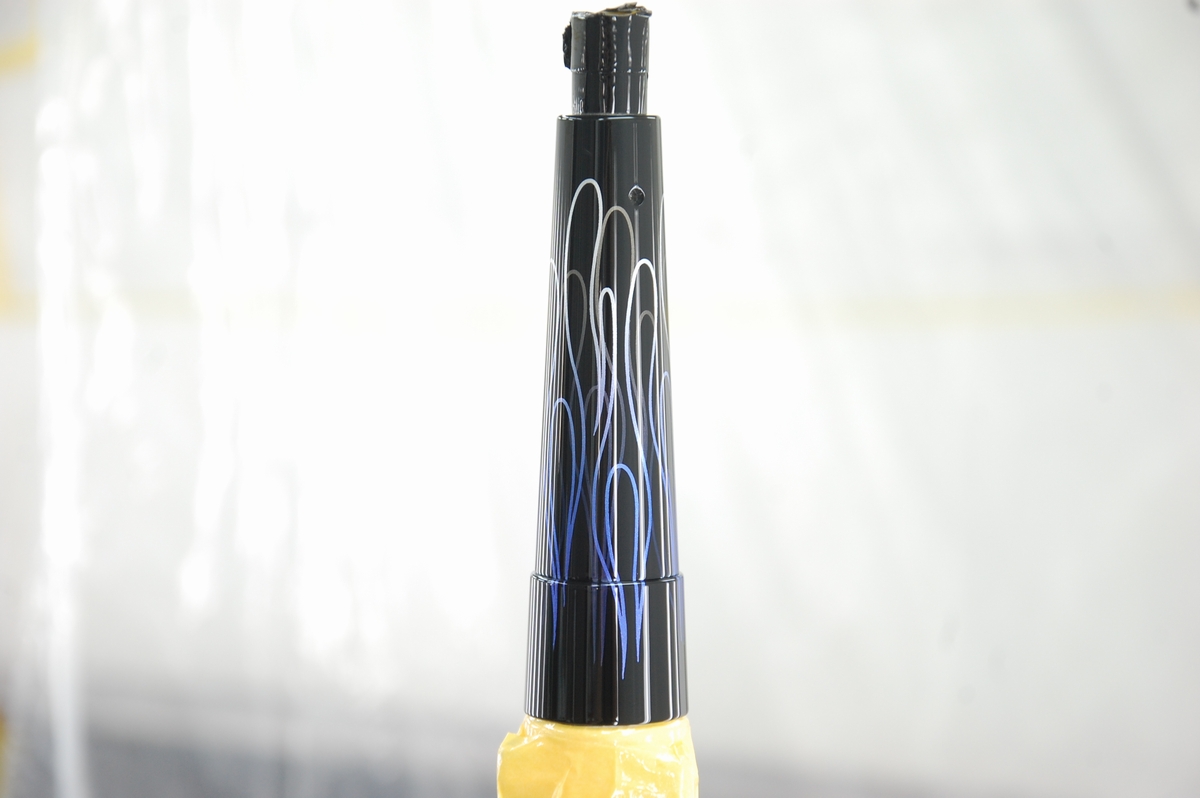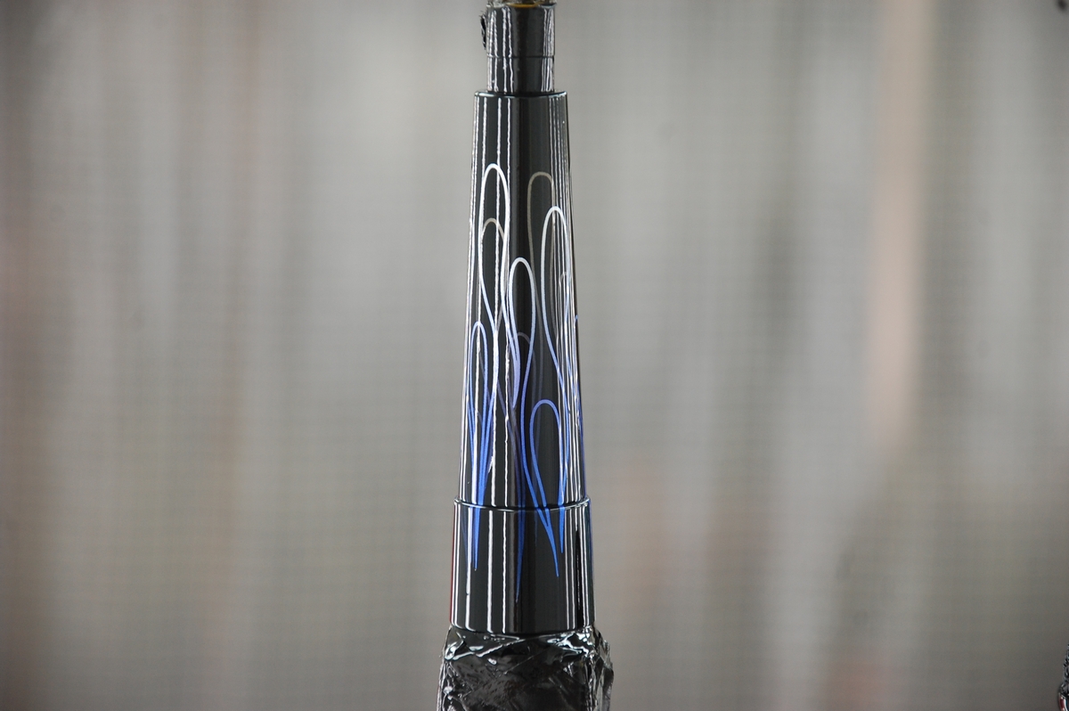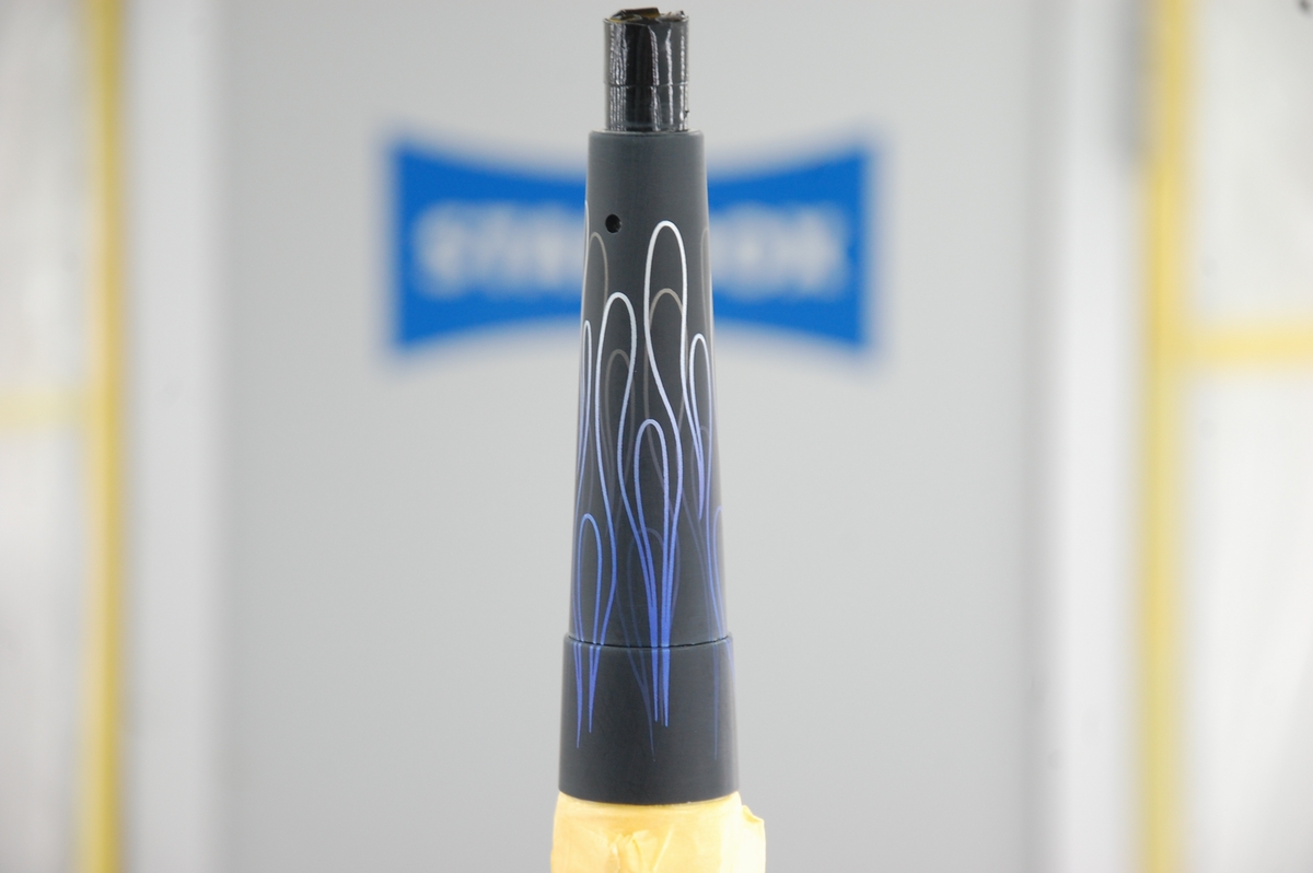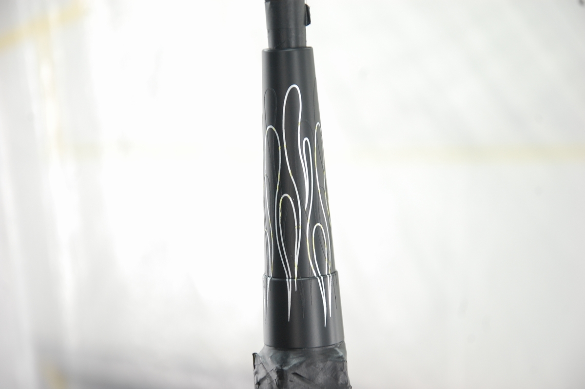 続けて2層目のファイアーパターンを貼ります。転写シートから貼った際は段差部分は浮いていて、その部分だけを押し込もうとするとマスキングが切れてしまいますから、一旦端から剥がし、谷の部分にしっかり押し込んだ後に再び貼り戻します。かなりデリケート且つ面倒な作業です。