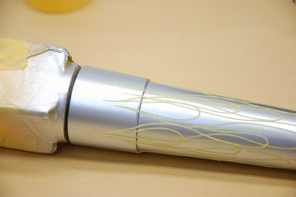 ただ赤味は後から追加出来るので、まずはKK-13そのままで始めます。色がかなり黄色味寄りなのが判るかと思います。塗り重ねていけば赤味は出るのですが、ファイアーパターン柄が見えなくなってしまうので、シルバーが透けて見える状態で色味が合うよう調整します。