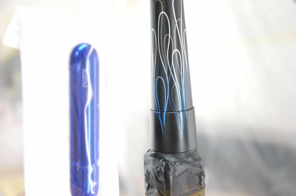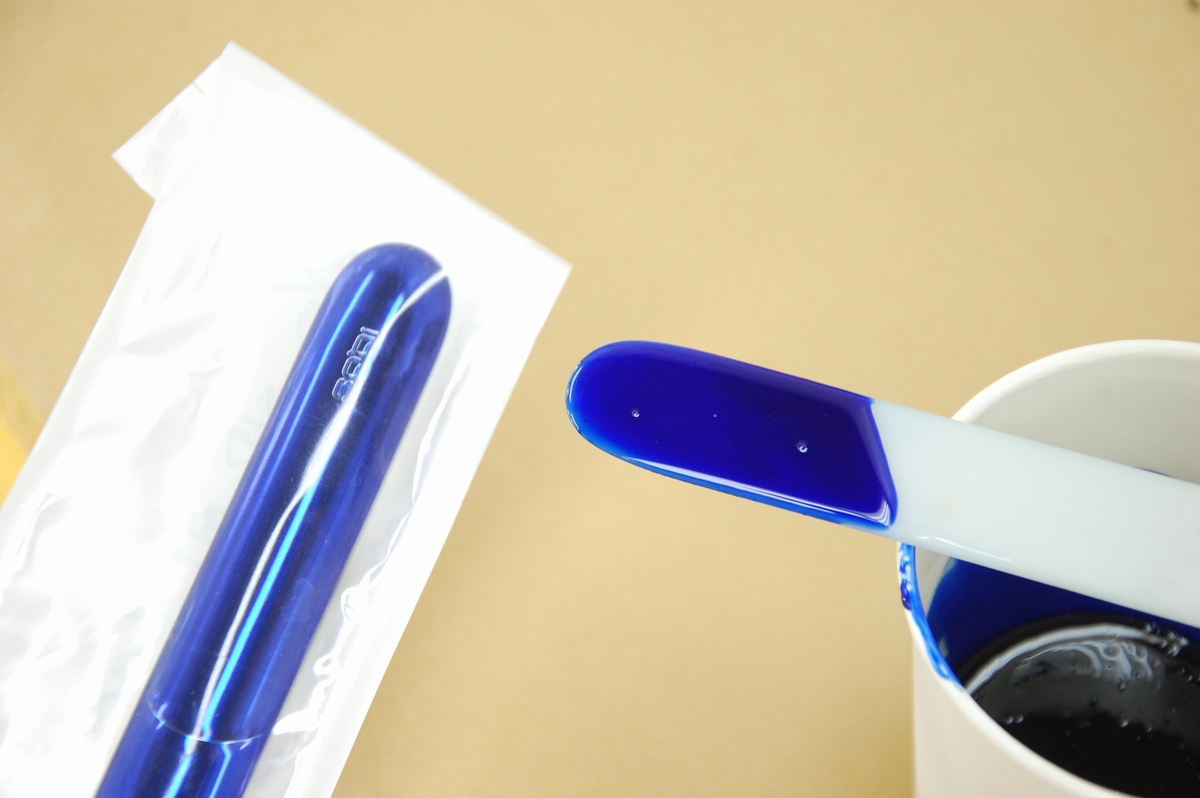 色については前回の青より赤味を足した「青紫」で承っていますので、塗料を調整します。ちなみに画像の色は前回使用した「KK-13 BURPLE」です。この状態だと見本に近いのですが、実際に塗ってみると(色が薄いと)赤味が全然足りないんですよね。