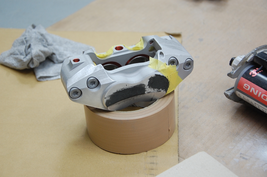 先日サーフェサーを塗っておいた、VMAXに装着予定のBERINGERブレーキキャリパー(リヤ用)です。その後60℃40分程の熱を掛けて塗膜を硬化させ、サフェを研いでおきました。