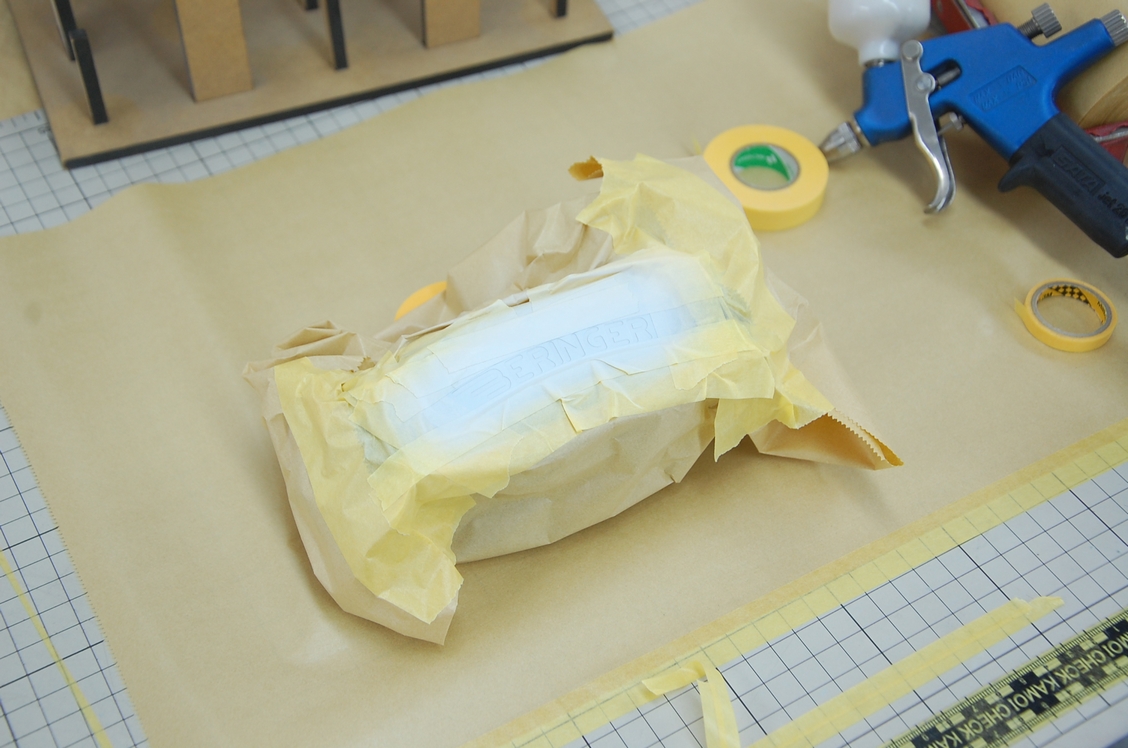 クリアーを塗りたくない箇所(車体固定部やガスケット取り付け部)をマスキングします。