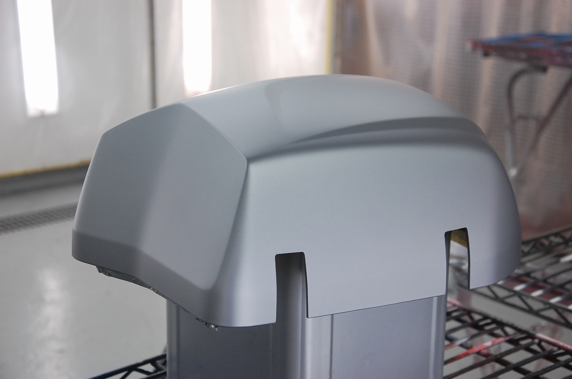 先日サーフェサーを塗っておいたBMW R1200R(2015〜)の純正パニアケース蓋です。その後恒温機に入れて60℃40分程の熱を掛けて塗膜を硬化させ、ガイドコートとしてベースコートの黒をパラパラと塗っておきました。