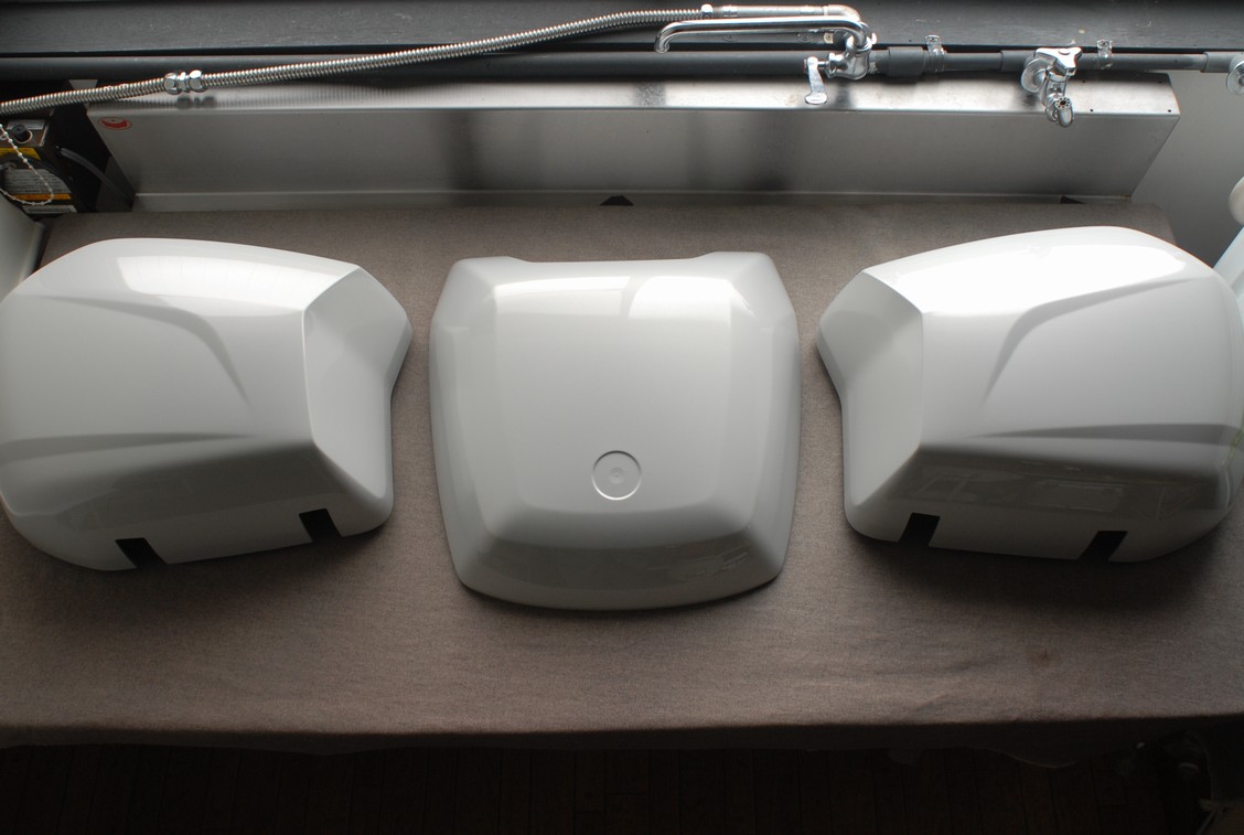 大変お待たせしました!先日本塗りを終えていたBMW R1200RSの純正トップケースカバーと左右パニアケースカバーの塗装、本日完成となります。