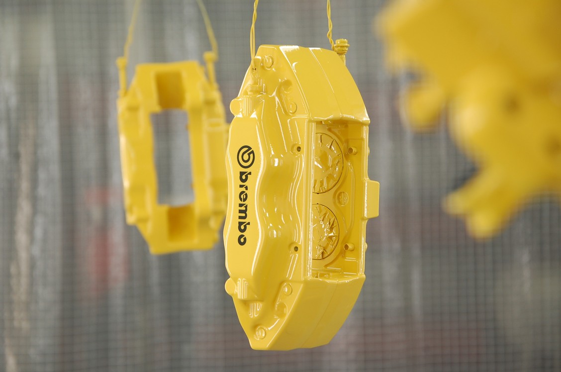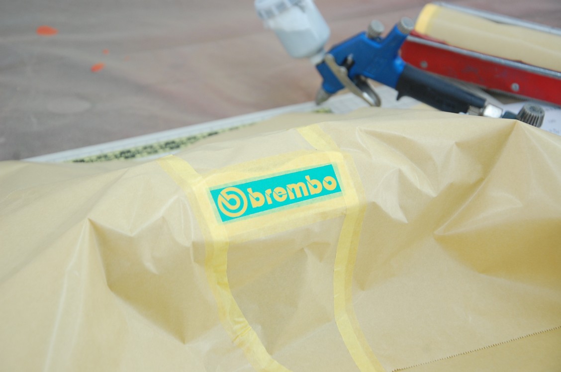 その後ベースカラーとなるイエローを塗り、用意したbremboのマスキングシートを貼ります。