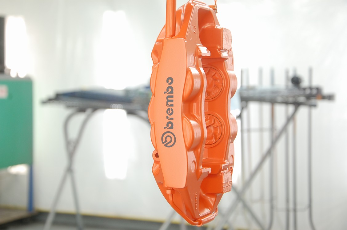 キャリパー本体の色は以前当店で施工したオレンジパールで承っておりますので、その時作っておいたデータを基に色を作製します。2コート仕様でも塗れるくらいの(ギリギリの)隠蔽力と、オレンジの鮮やかさを両立するようにしています。オレンジ・レッド・イエローの原色に、粗目のイエローパールと着色オレンジパールを使っています。