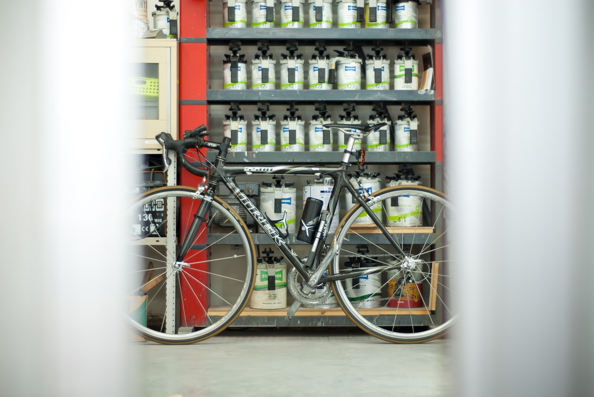 で、本日も朝から雨でしたから通勤手段はカブとなり、TREKはもう一日工場にお泊りになる事になりました。ちなみに奥にあるのは普段は使わないSTANDOXの1コートソリッド用の塗料で、ミキシングマシーンは知り合いの板金塗装屋さんに頂いた物です。この光景、どこかで見たような気が・・・と思ったら以前自宅でもcannondaleで撮っていましたね。
