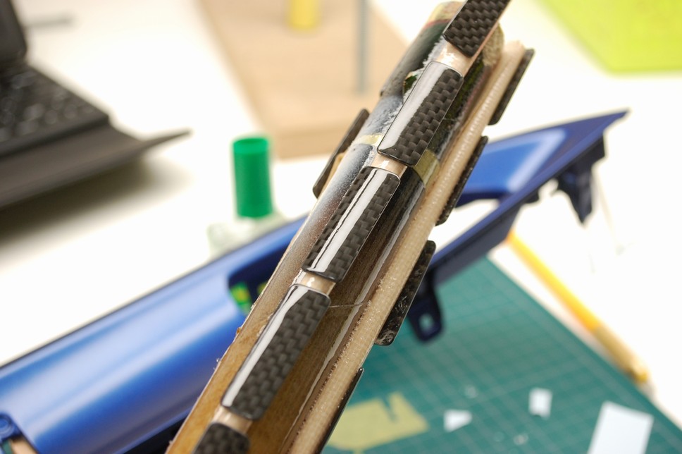 上の画像はカーボン板を作製してから下塗りのクリアーを二回行った状態で、これを見たJIROちゃん曰く「スゲ~綺麗じゃないっすか~!」との事ですが、いやいや本塗りはまだこれからなんですよ!