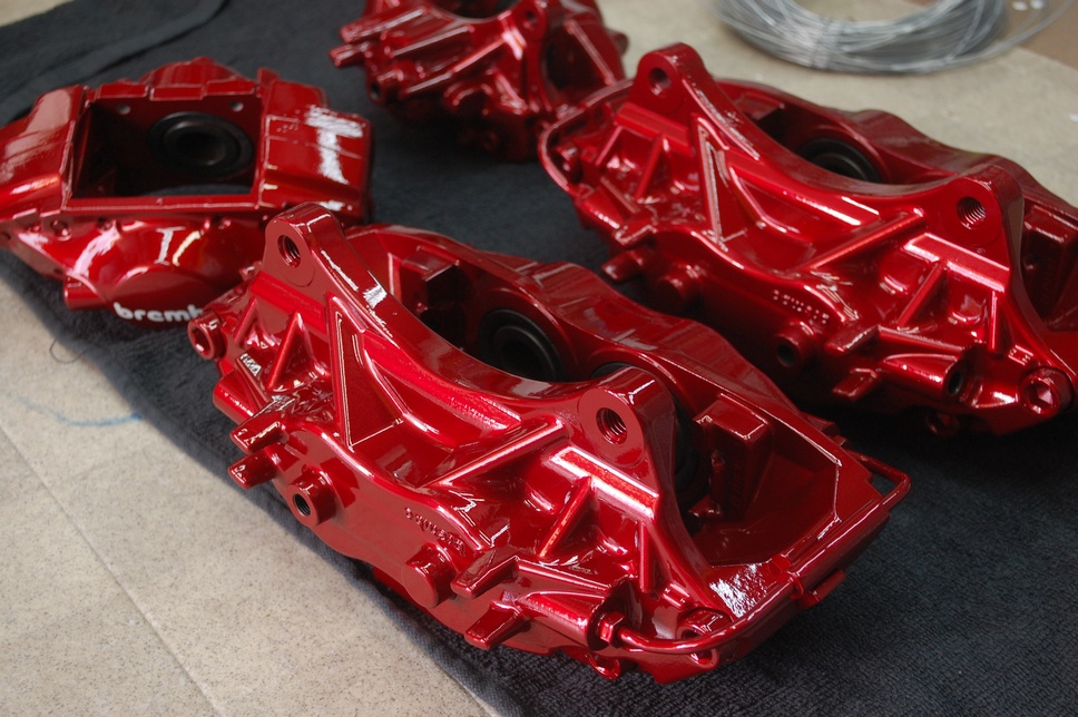 いつもご贔屓を頂いている業者さんからのご依頼で、「明るい赤メタリックに」とご指定を頂いたブレンボブレーキキャリパーです。ただ考えてみると赤系の明るいメタリックはキャンディー塗装じゃなければ不可能!という事に気づき、シルバーを塗ってから透過性の赤=キャンディーレッドを塗る事にしました。