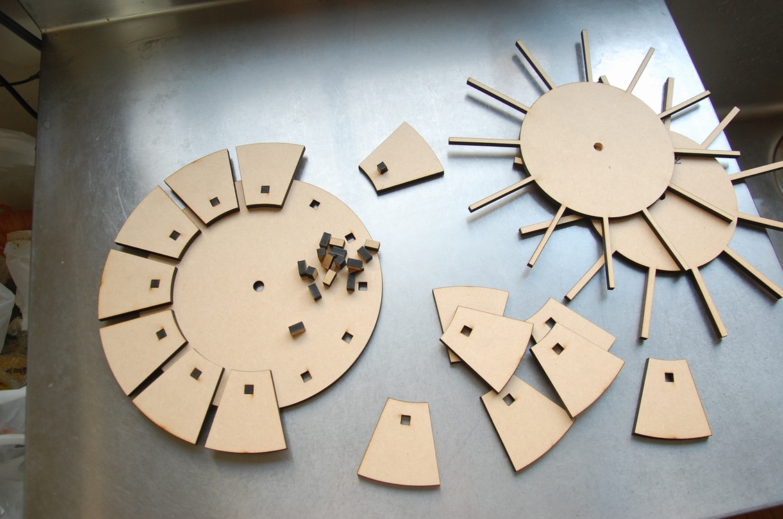 今まで作っていた壁時計はこちらの色相環に塗装した物ですが、今回はこれの型を応用して新たな物に挑戦しています。