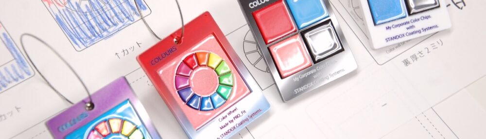 色見本キーホルダーの制作では4色まで使用可能ですが、クロマフレアカラーは3コート塗装となる為にこれ1色で2色分となります。ただクロマフレアカラーの下色は黒なので、4ピース色見本ではこの黒も使えるようになります。