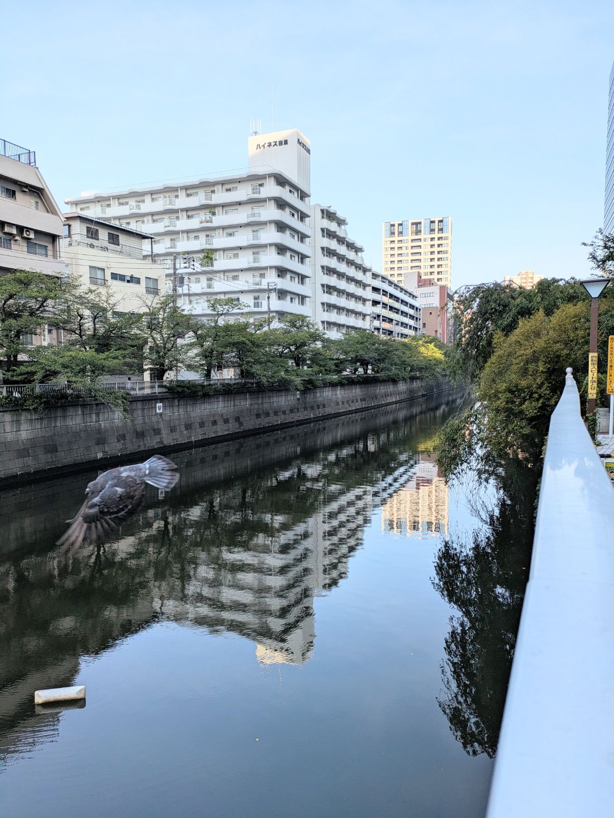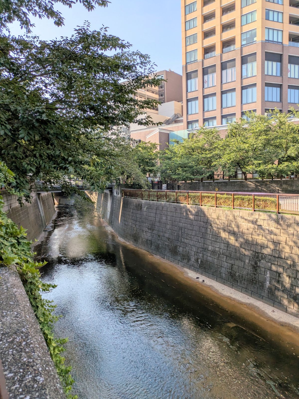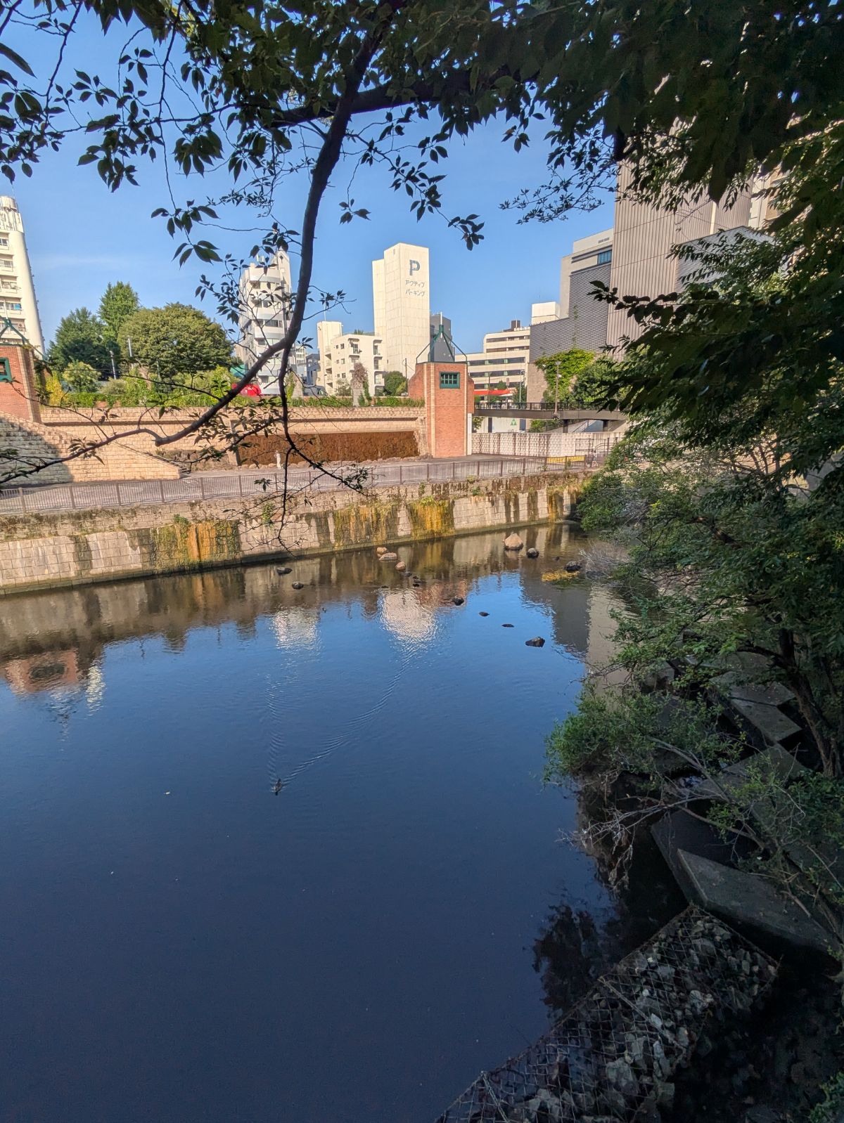 ただ気温が上がる前の早朝で、しかも川沿いは桜並木の日陰道を歩けますから、日中の暑さを考えると全然歩けない感じはありません。いつも見ている呑川と同じく目黒川にも多くの魚(恐らくはボラの子供=イナッコ)や野鳥などの自然を感じられるのが良いですね。新宿御苑には届きませんが、水辺が近い分駒沢公園よりは身近に感じられると思います。