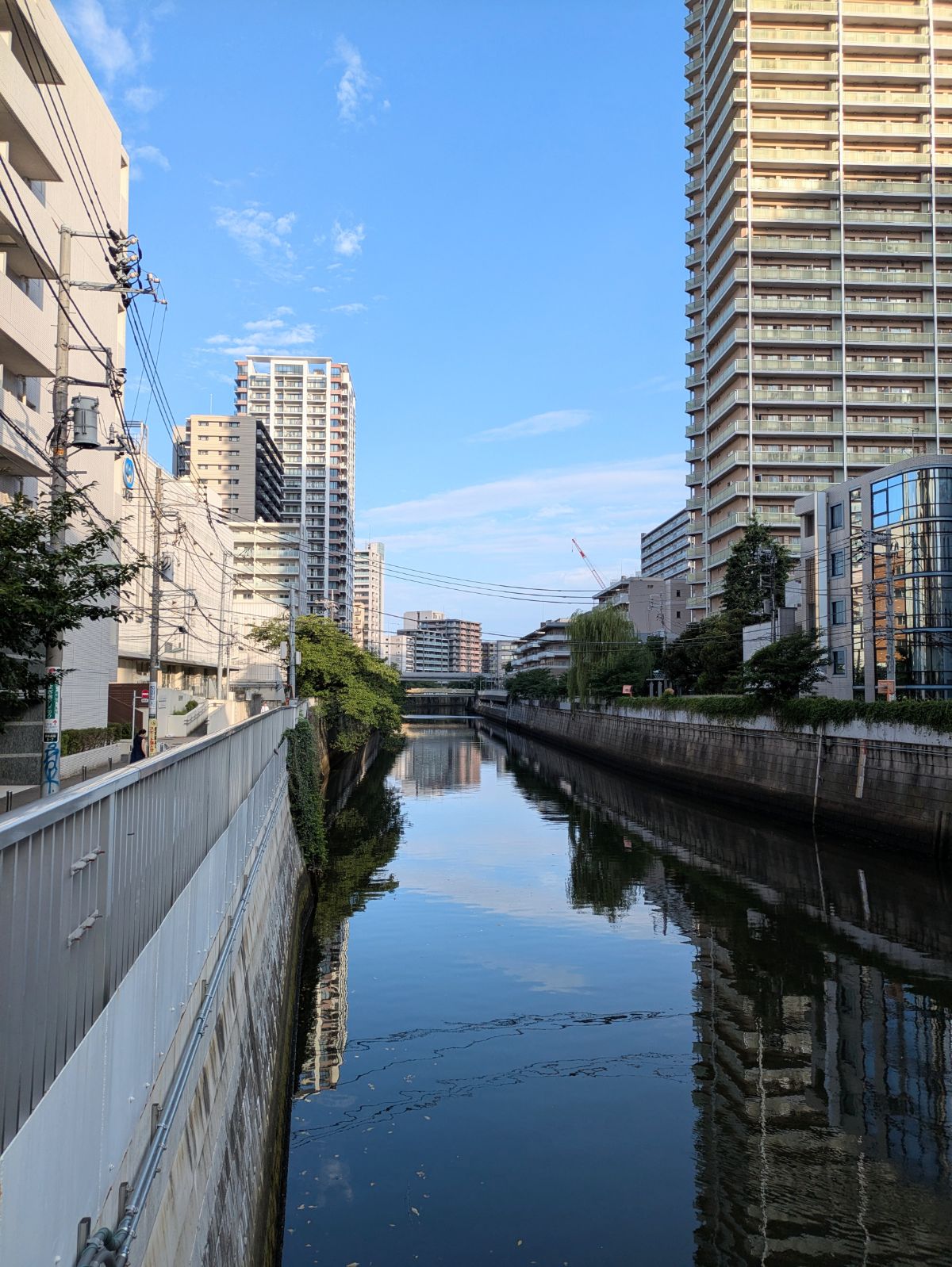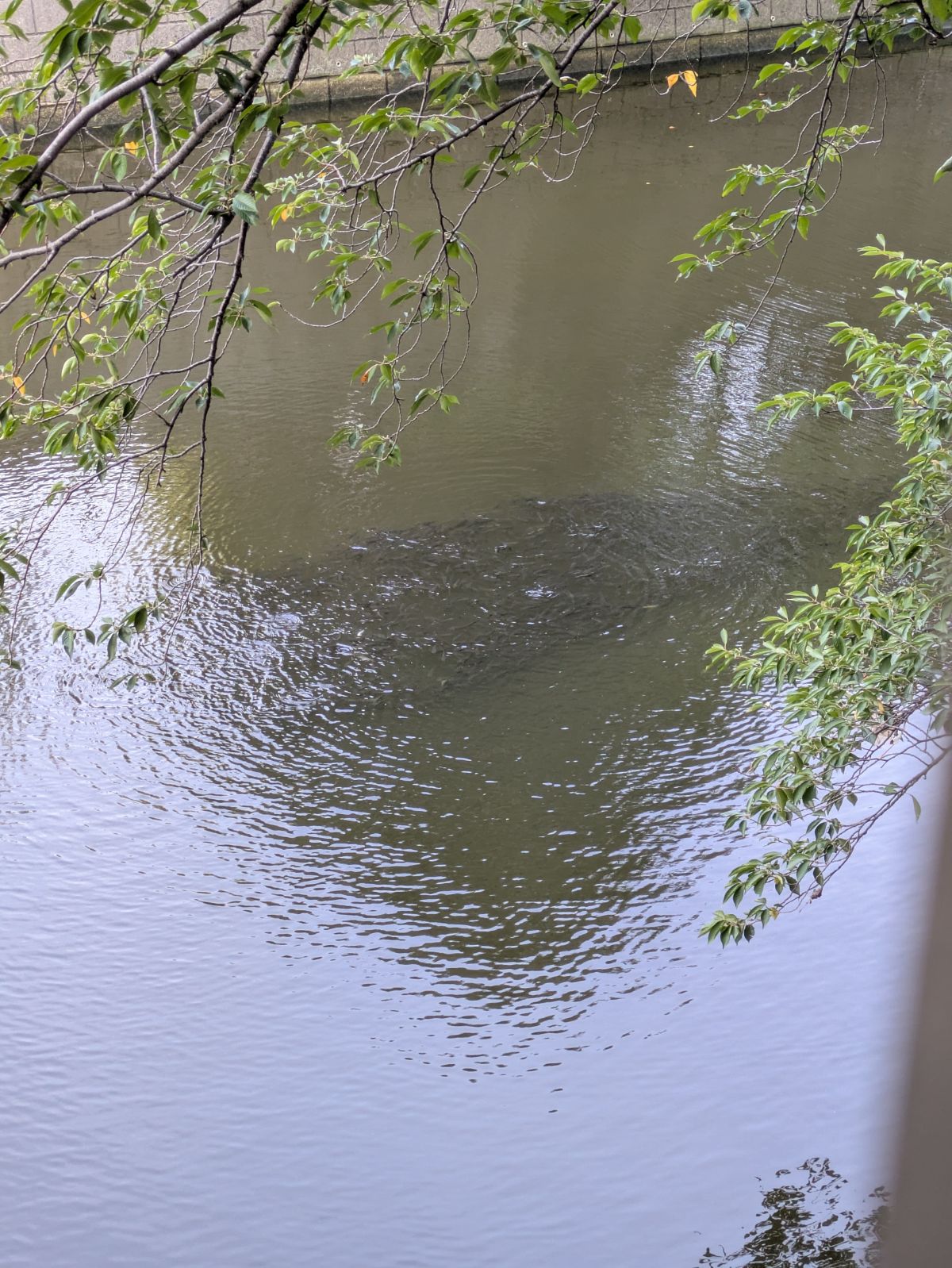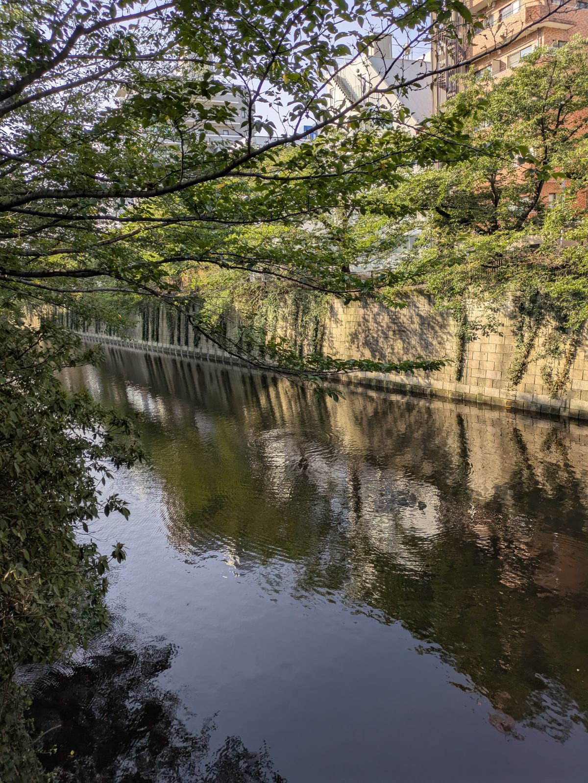 ただ気温が上がる前の早朝で、しかも川沿いは桜並木の日陰道を歩けますから、日中の暑さを考えると全然歩けない感じはありません。いつも見ている呑川と同じく目黒川にも多くの魚(恐らくはボラの子供=イナッコ)や野鳥などの自然を感じられるのが良いですね。新宿御苑には届きませんが、水辺が近い分駒沢公園よりは身近に感じられると思います。