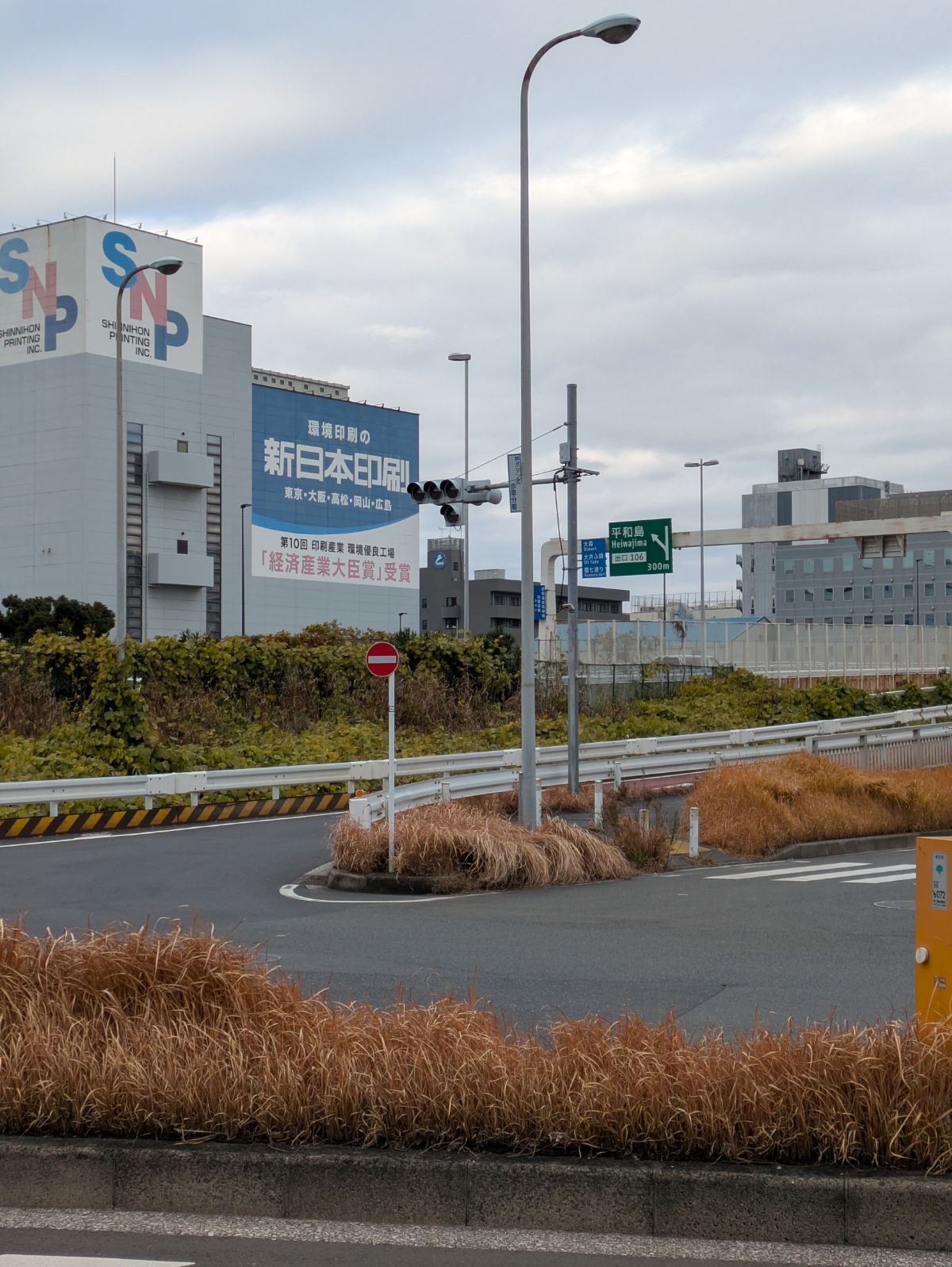 ガスタンクか何かかと思いましたが、どうやらこの球は建物に埋まった半円球状の物で、日の丸自動車のモニュメントの事でした。てっきり建物の手前に球があるのかと思ってました。