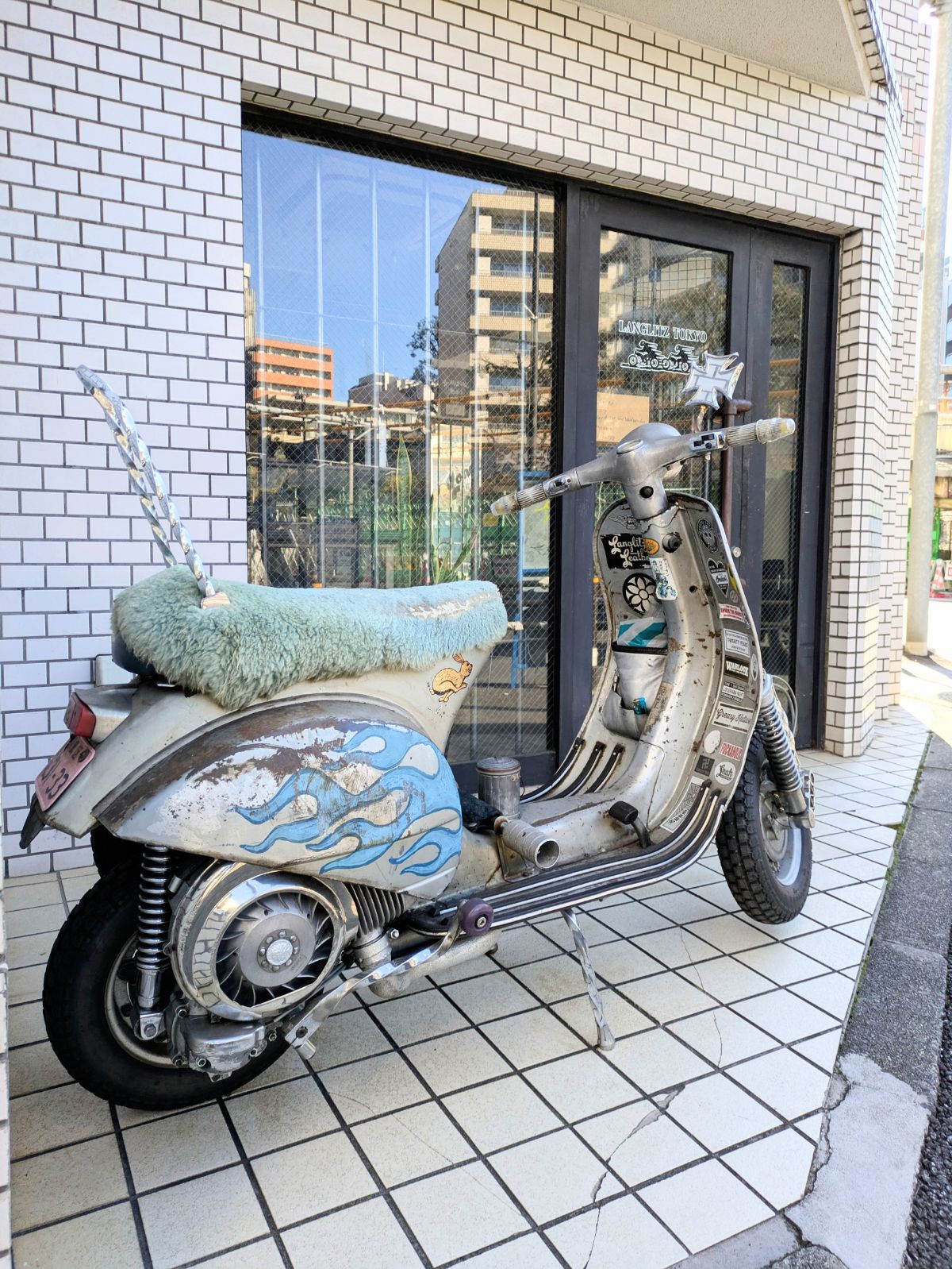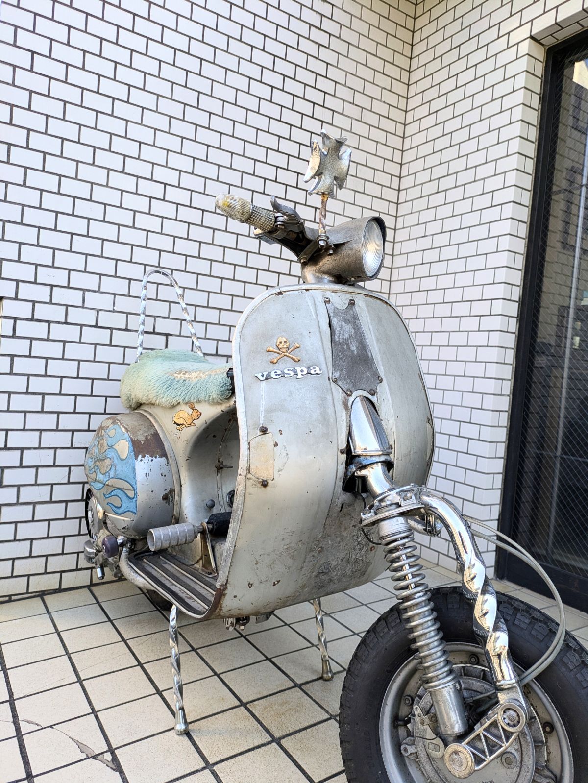 ガラスの窓際にキャブなど見知ったパーツが並んでいたので入り口を見てみると、格好良いベスパが!