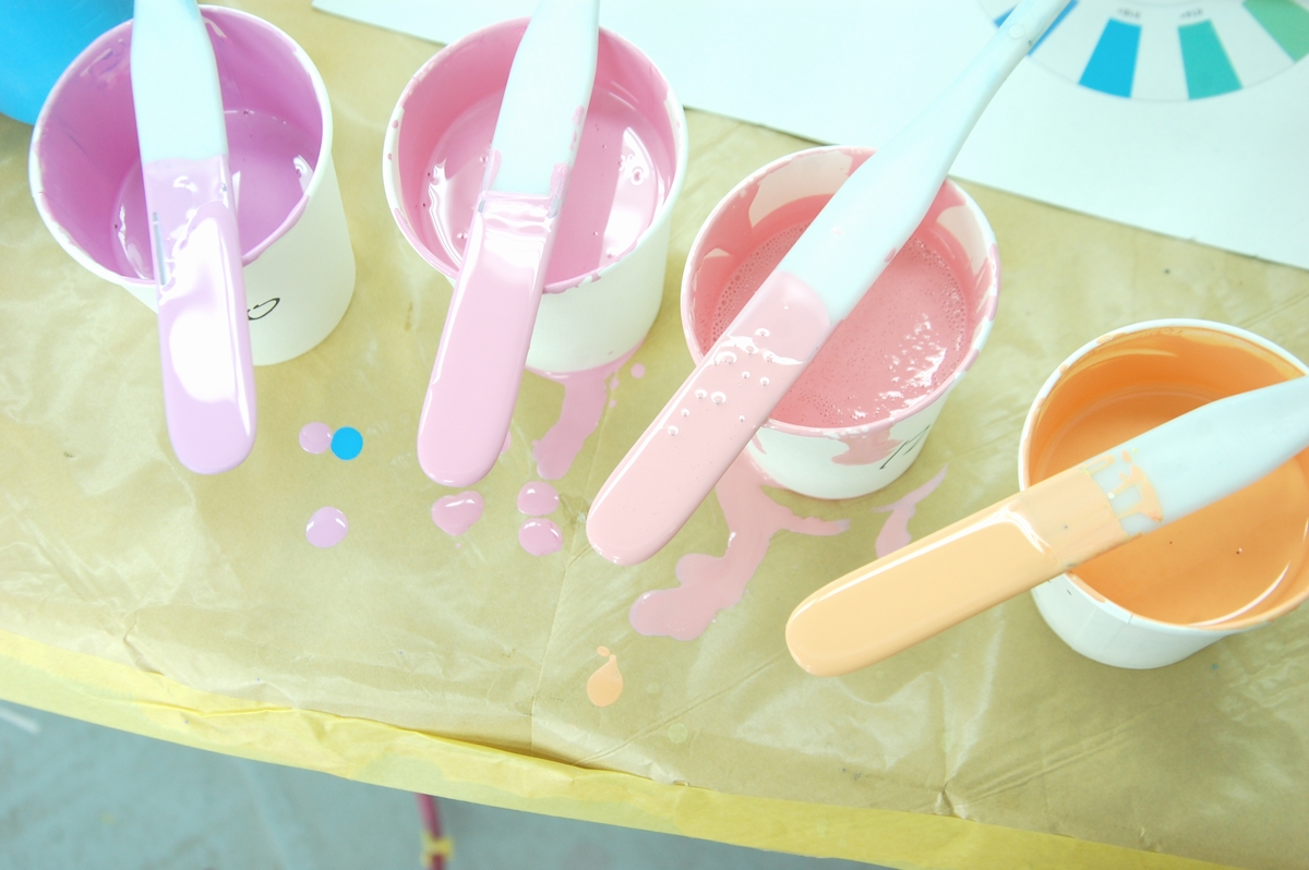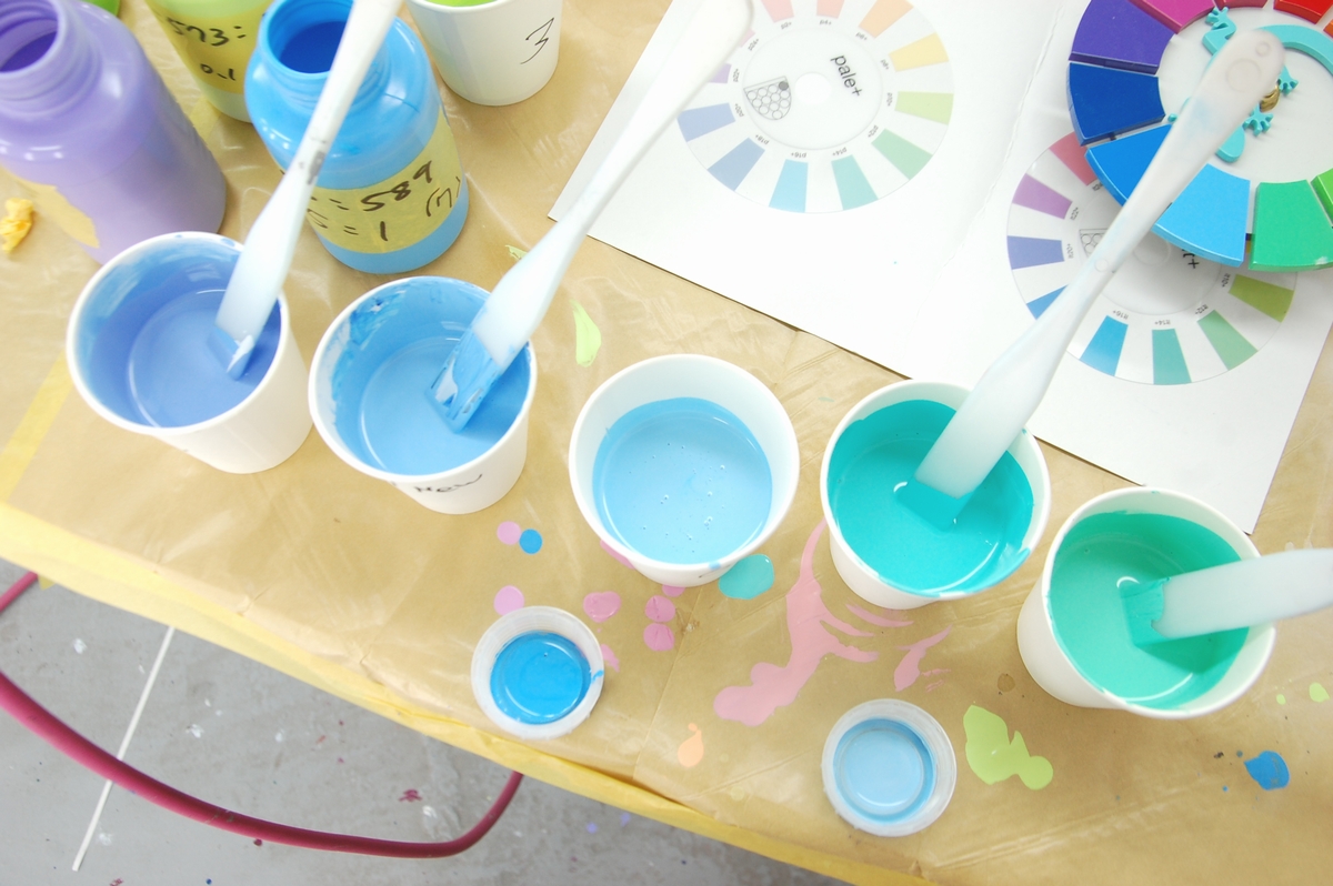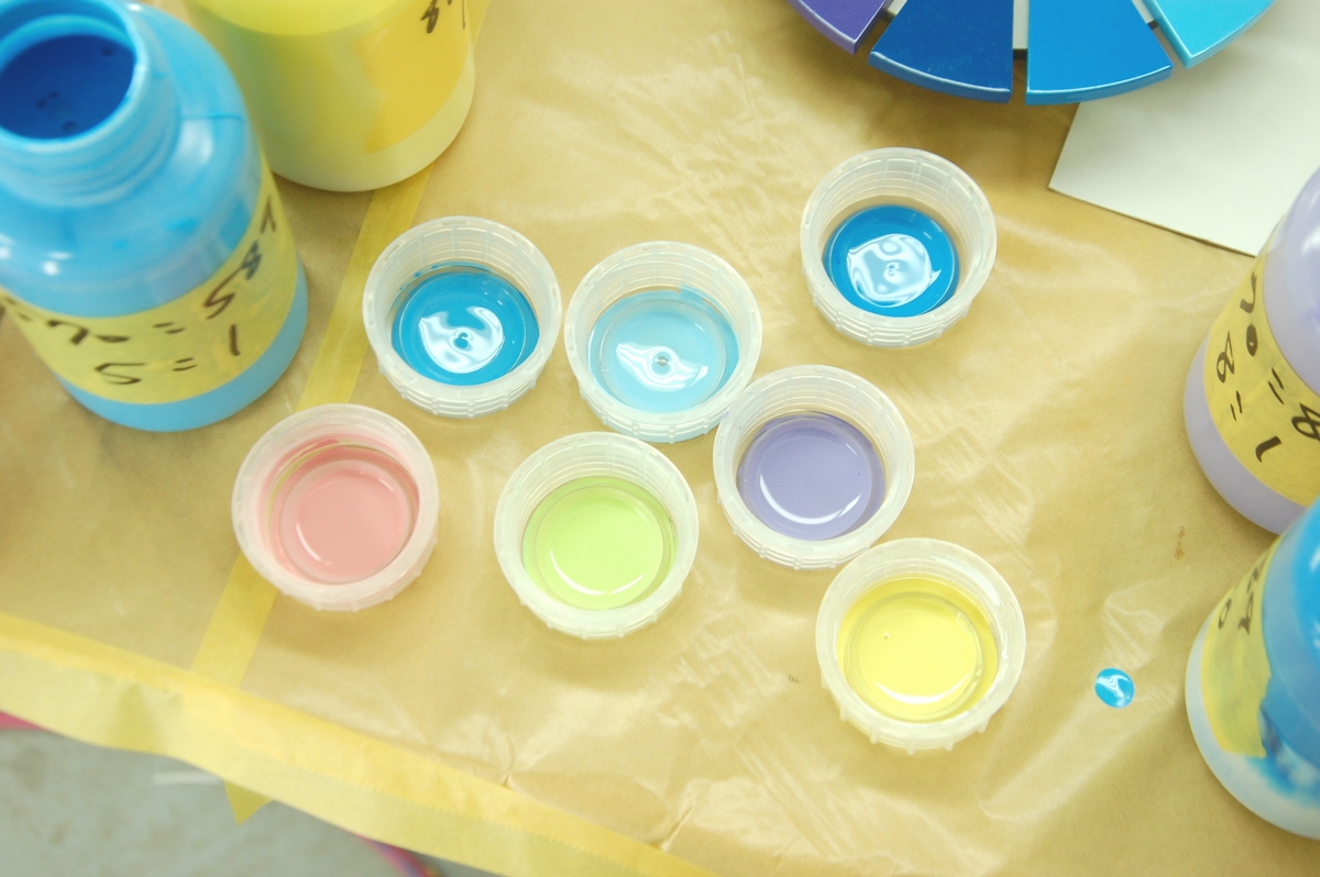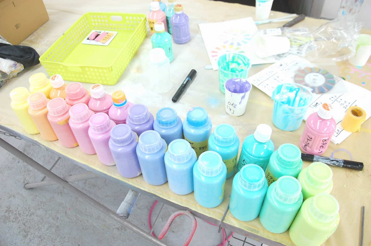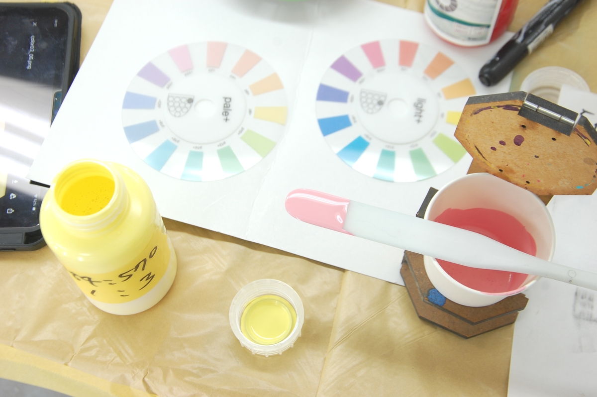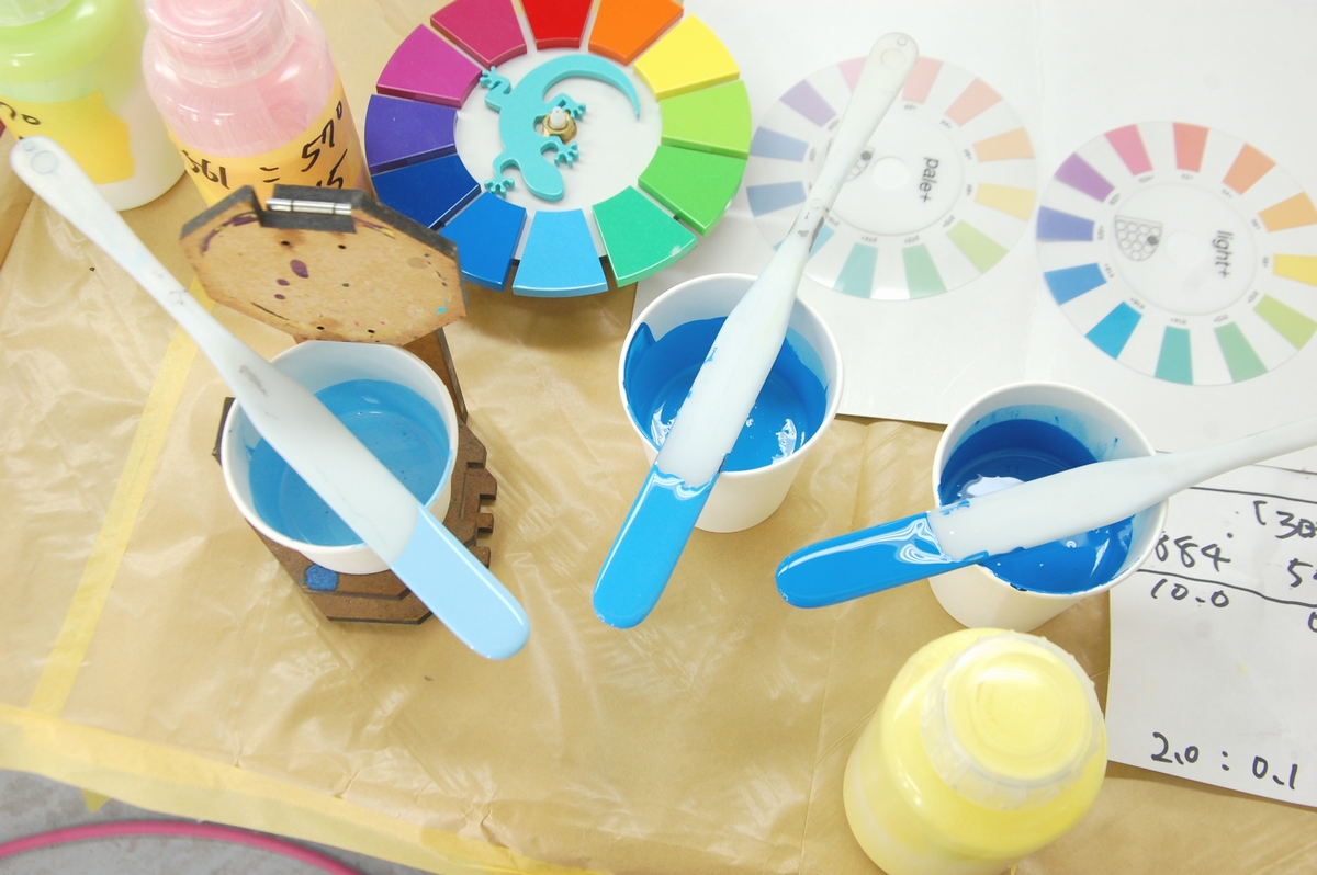 その後は工場一階に移り、各原色を混ぜてお好みの色を作って貰います。
