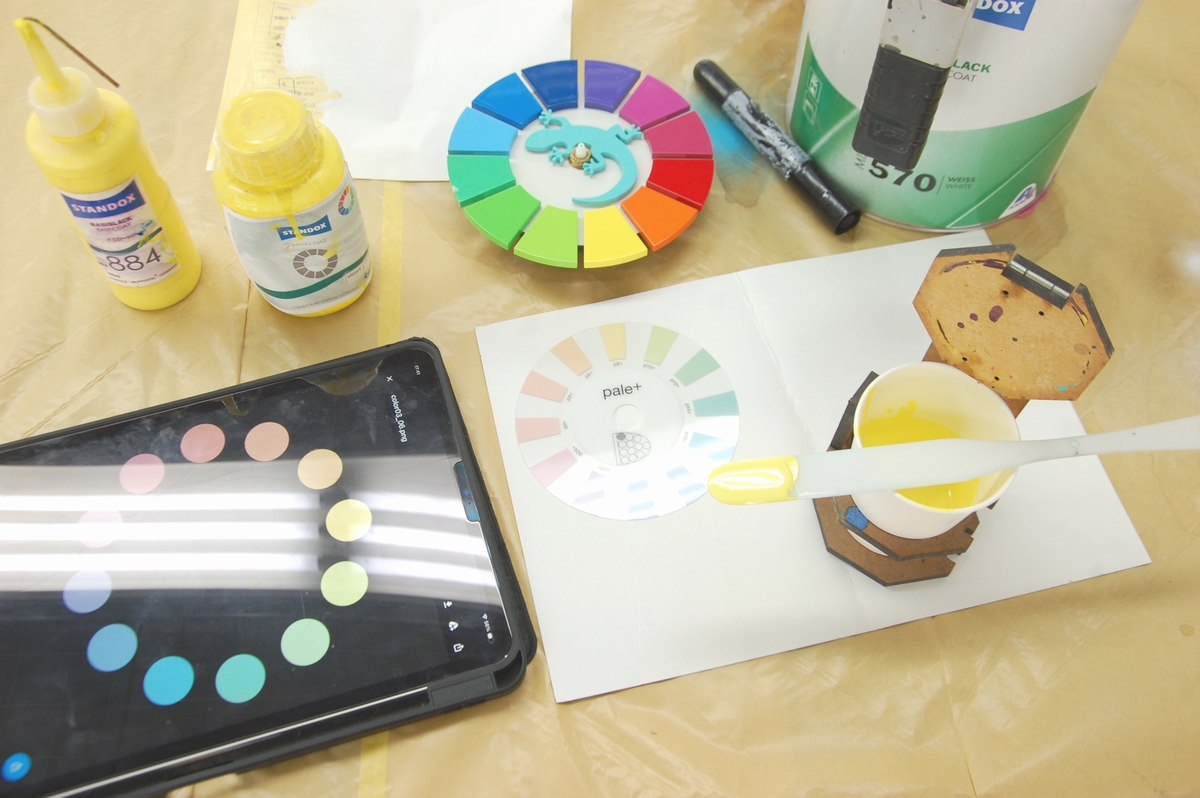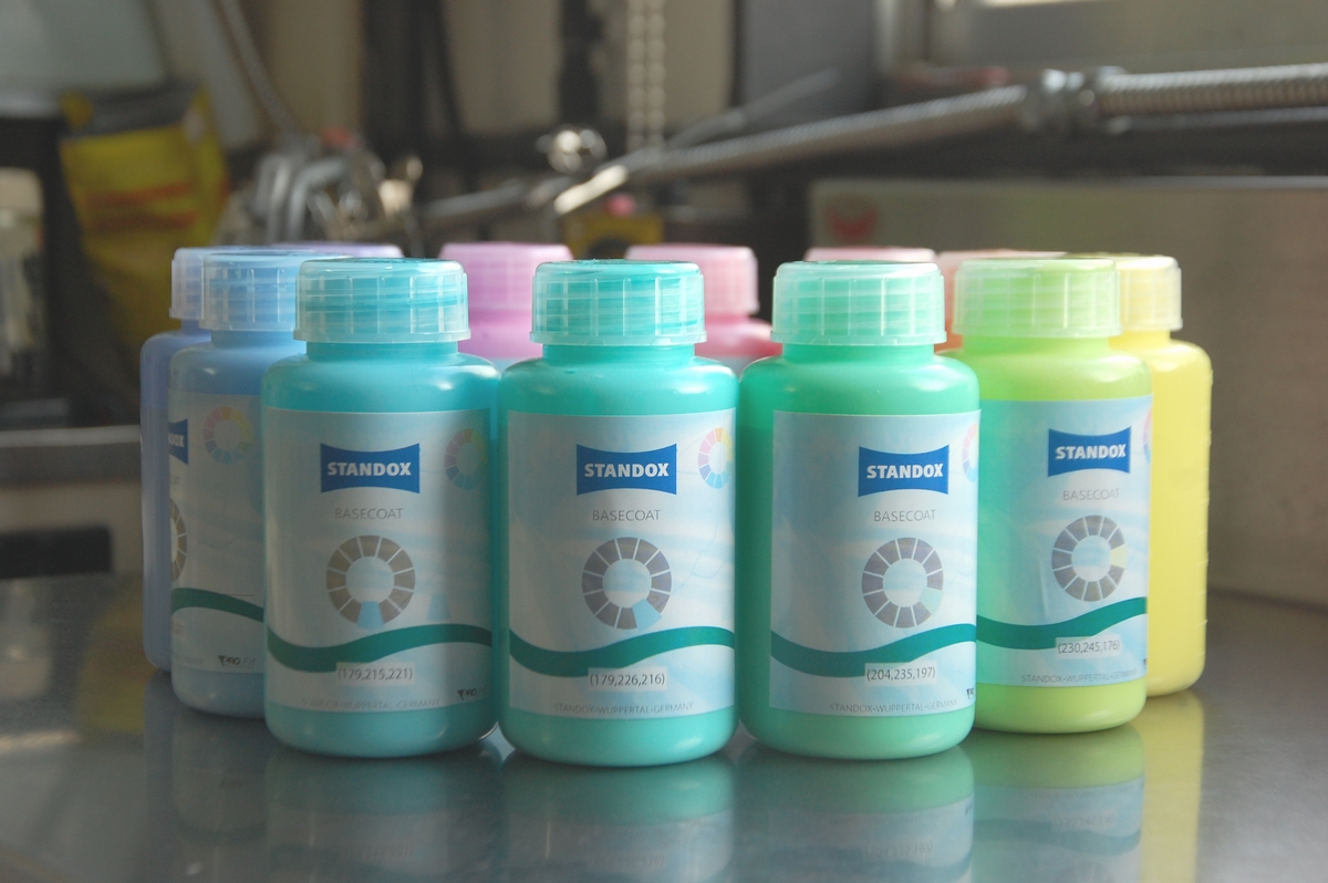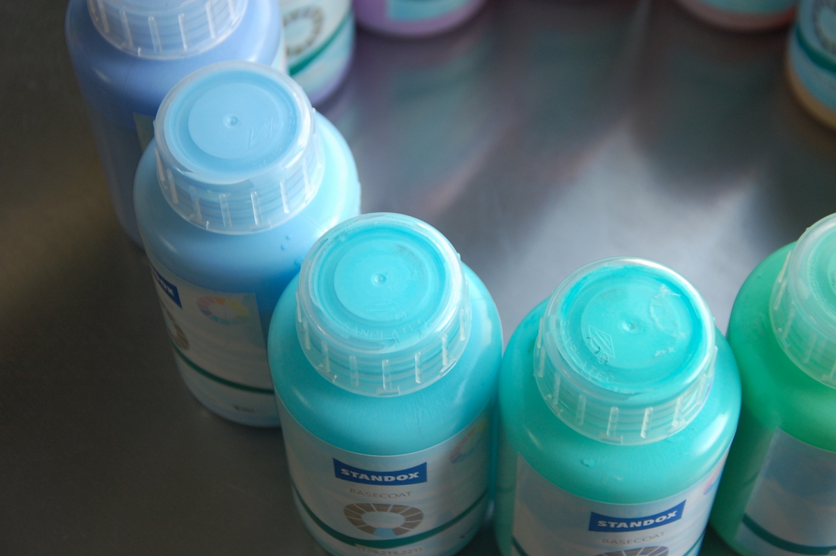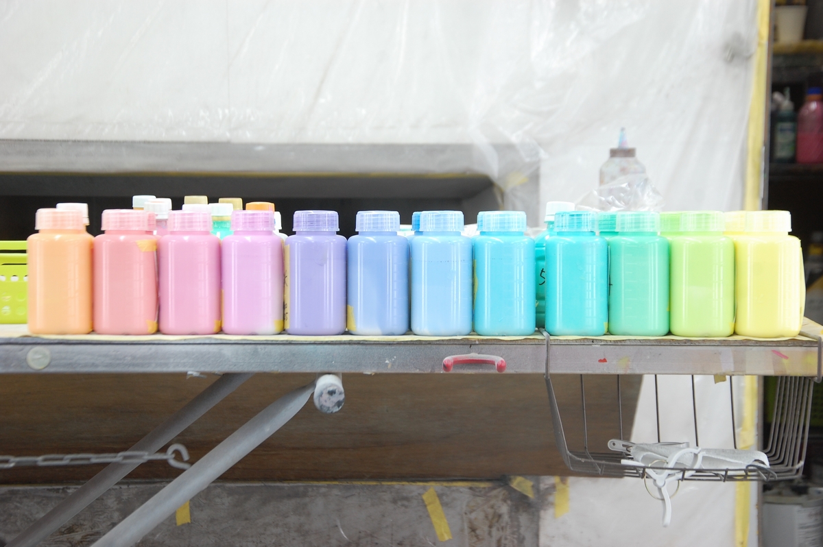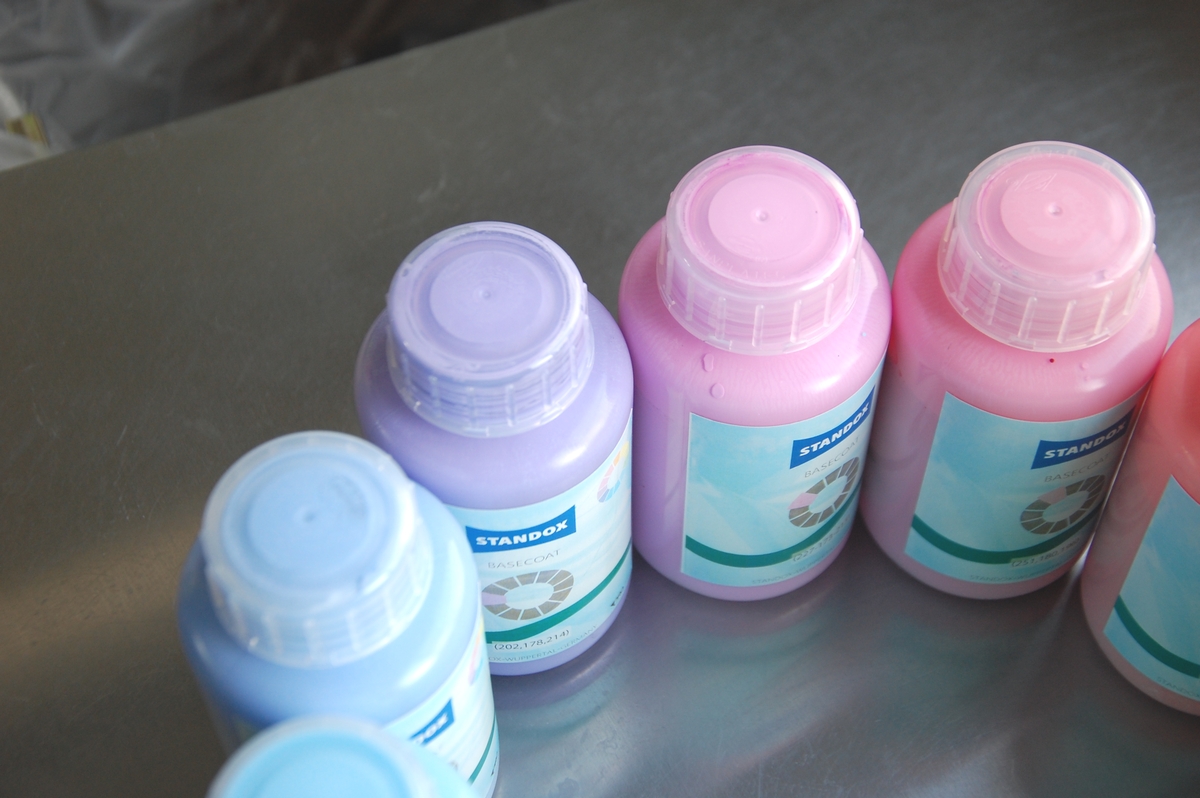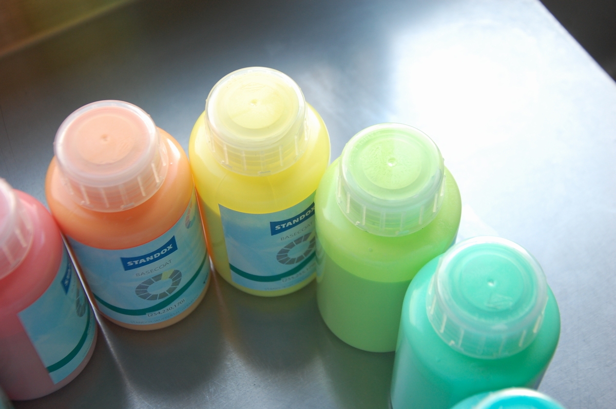 出来上がった塗料にハードナーを添加し、あとはお好きな方法で色を飛ばして着色していきます。