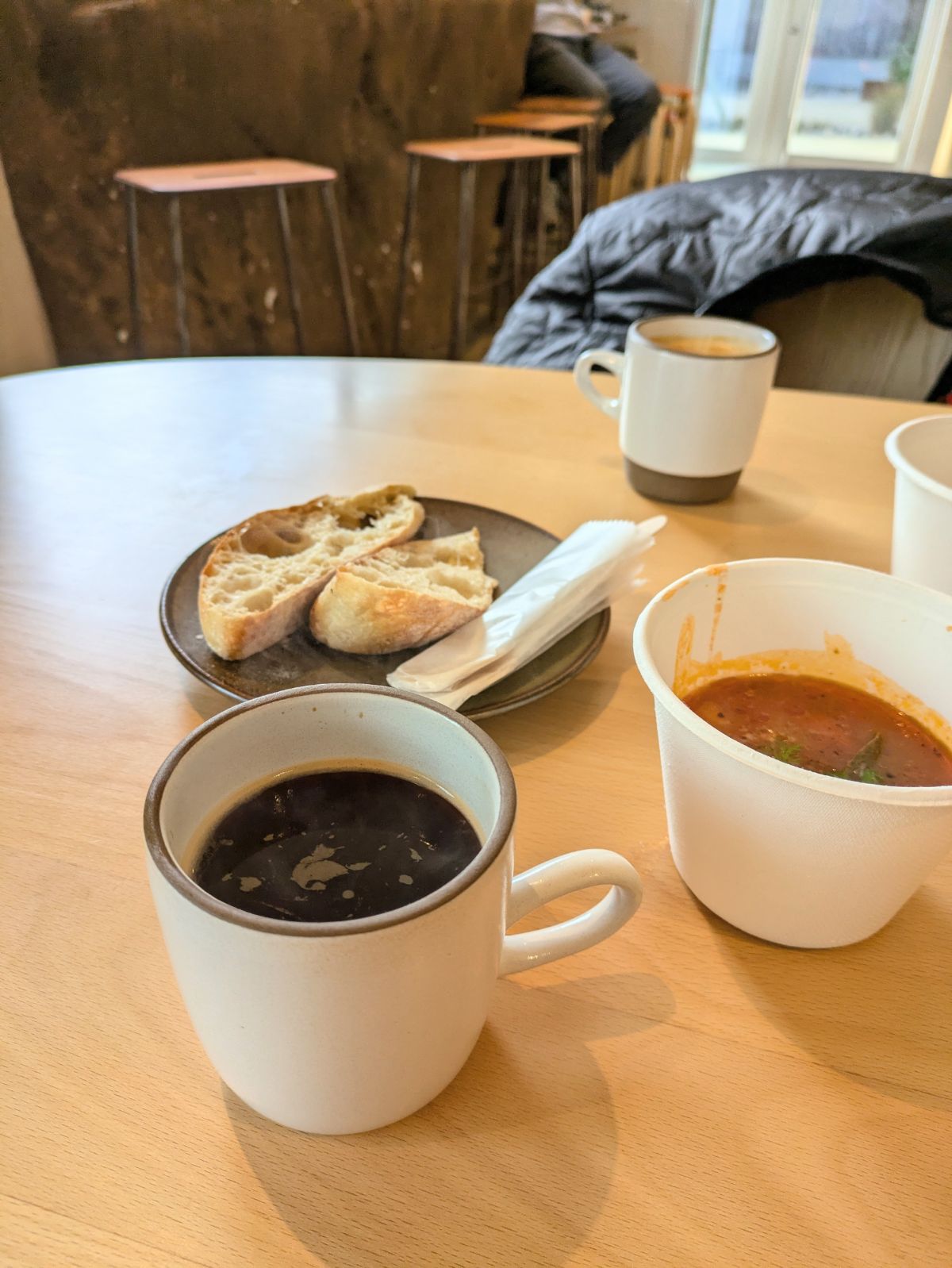 元日は初日の出を見に来る方が多い為か朝5時からオープンしていて、今回は珈琲とミネストローネ(パン付き)を頂きました。冷えた身体に暖かいスープが染み渡ってとても美味しかったです。