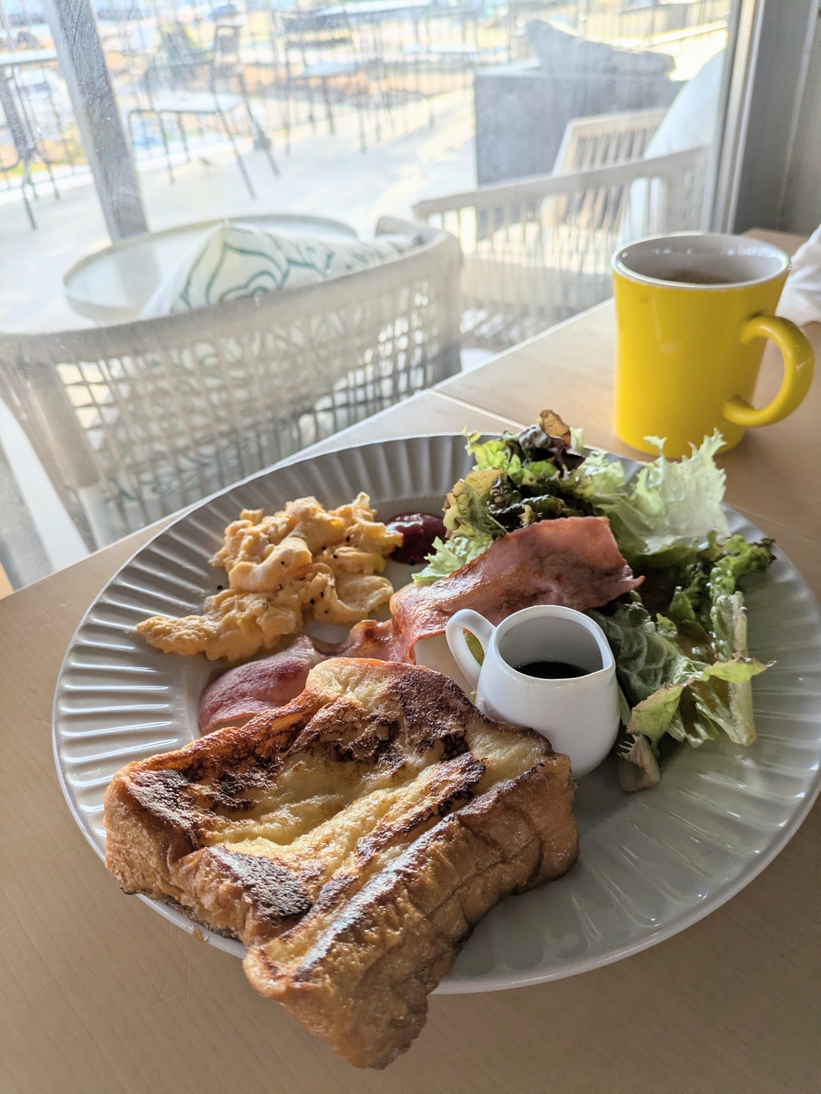 一階ではパンが購入出来て、モーニングプレートは二階で注文するスタイルです。眺めが良いのでテラスに出たいところでしたが、今回はとても寒いので室内で(笑)。