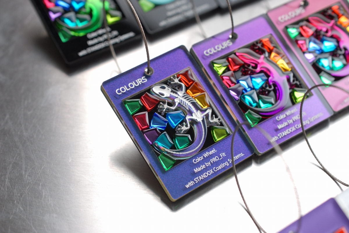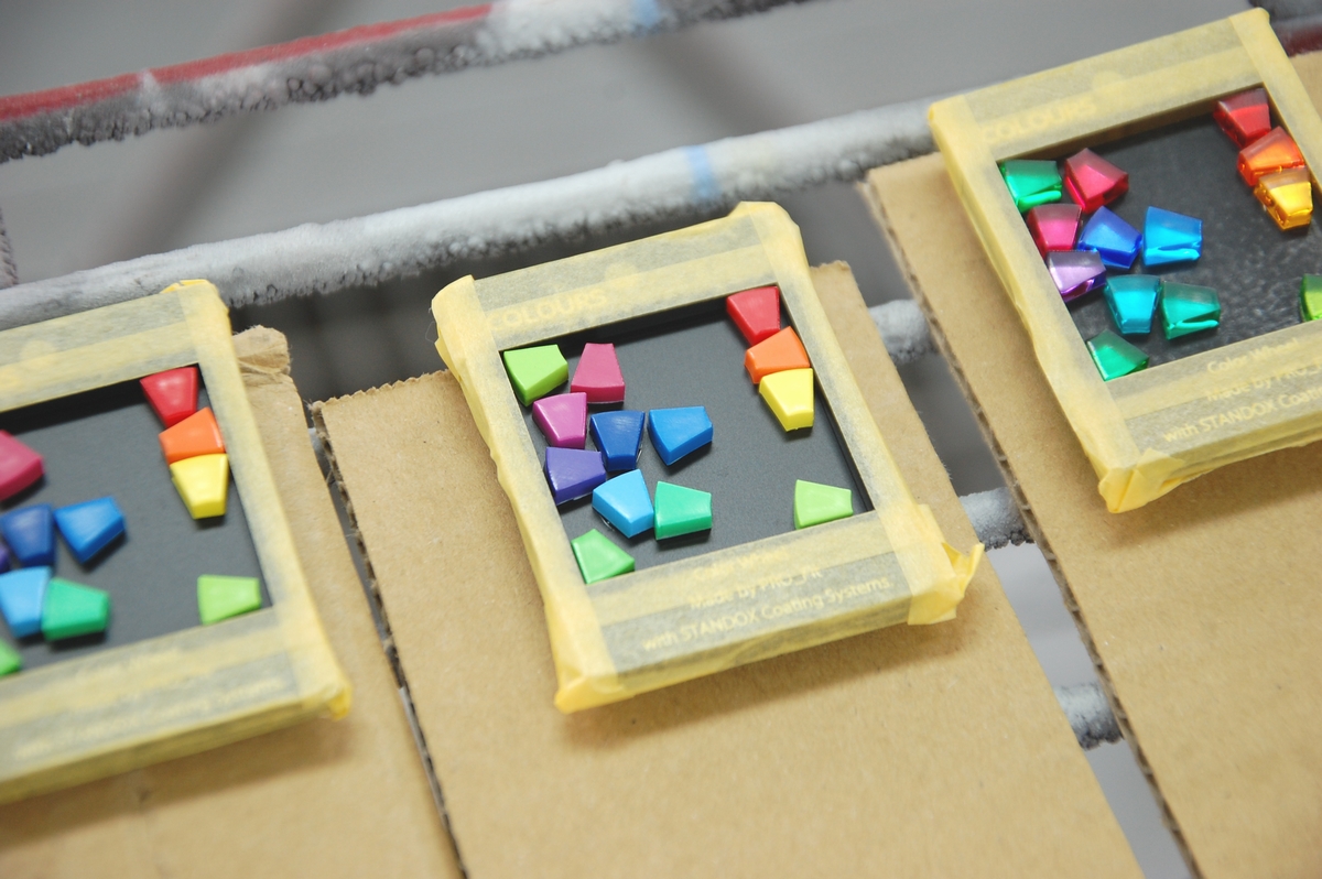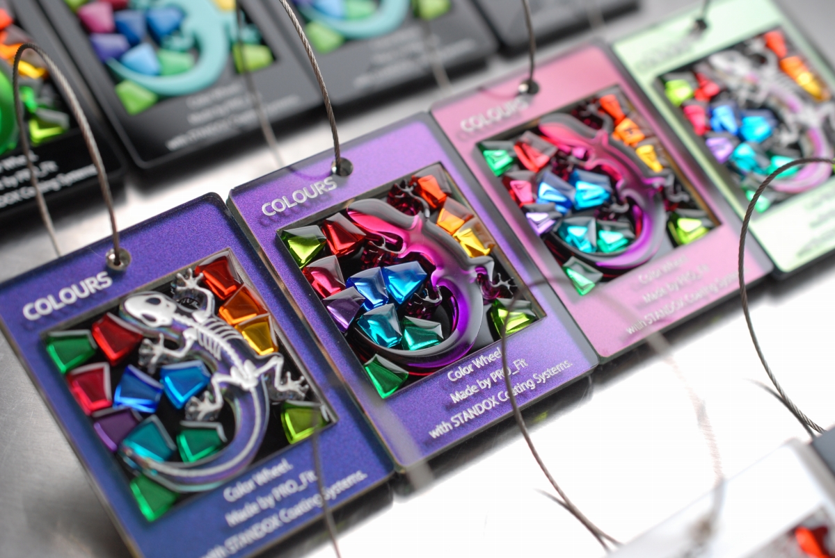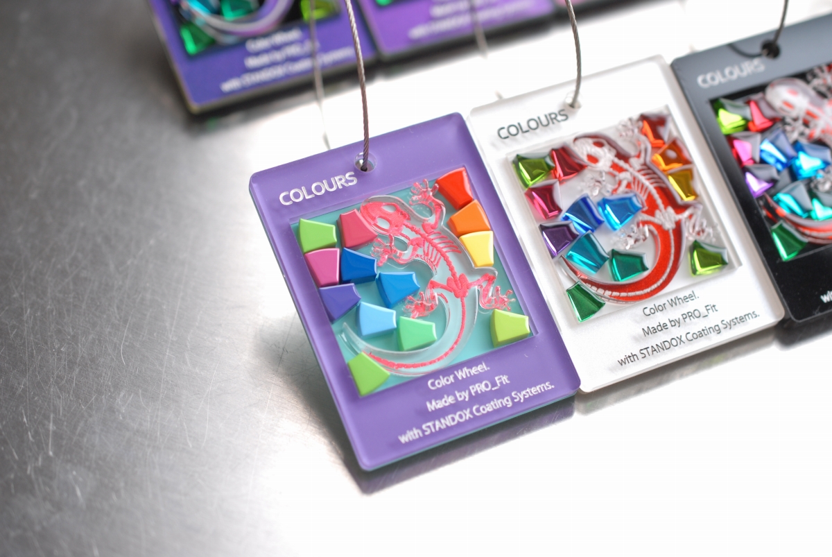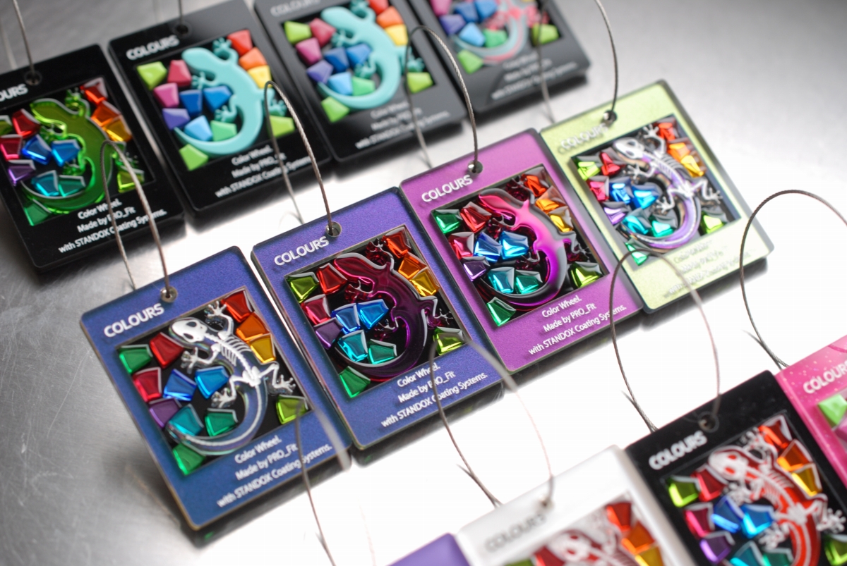 色相環12色のピースを散りばめて作成しています。一つ一つレーザーで切り出して塗装を施したオリジナルのハンドメイド品となります。塗料も全てSTANDOXです。