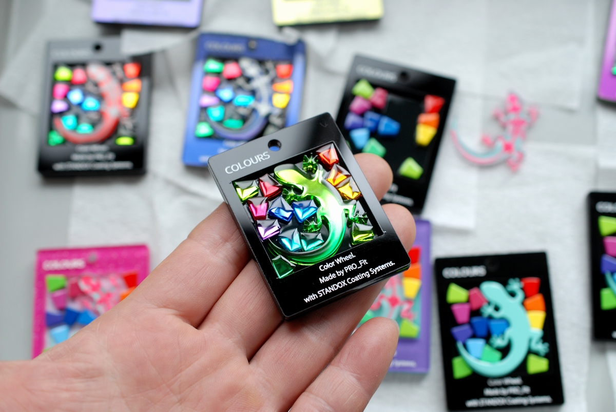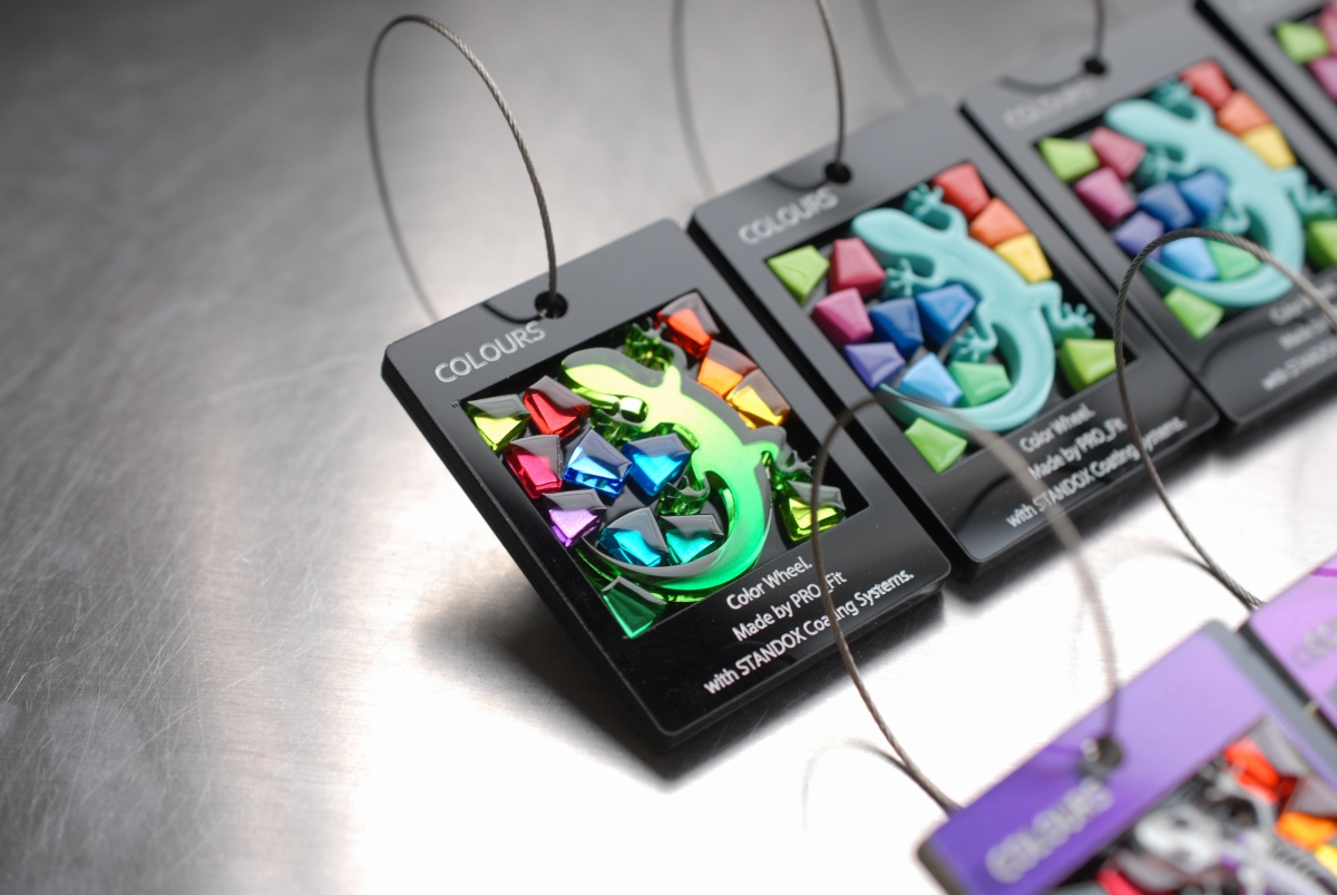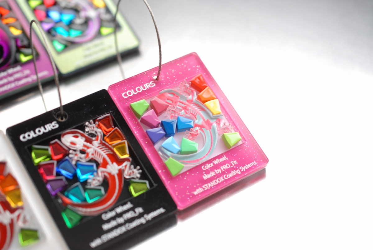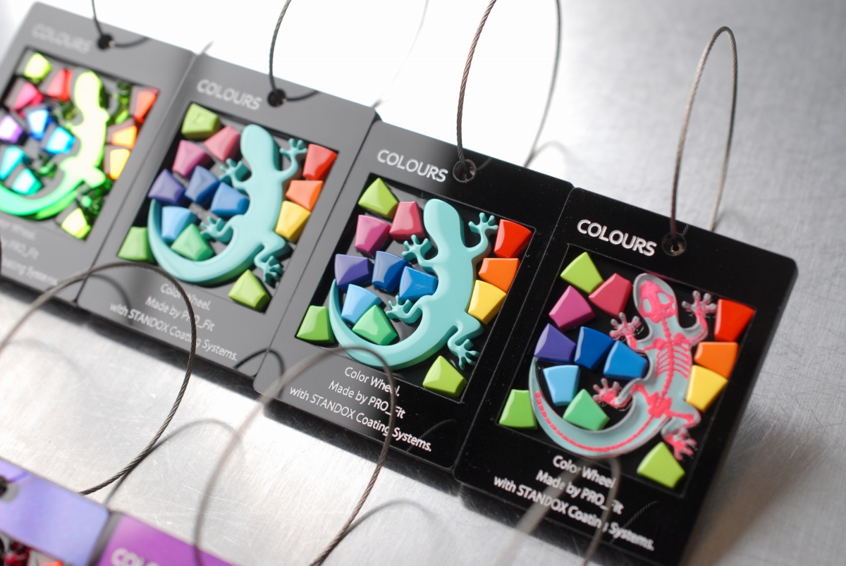 5月のデザフェスで販売を予定している色相環のピースとヤモリを組み合わせた色見本キーホルダーです。