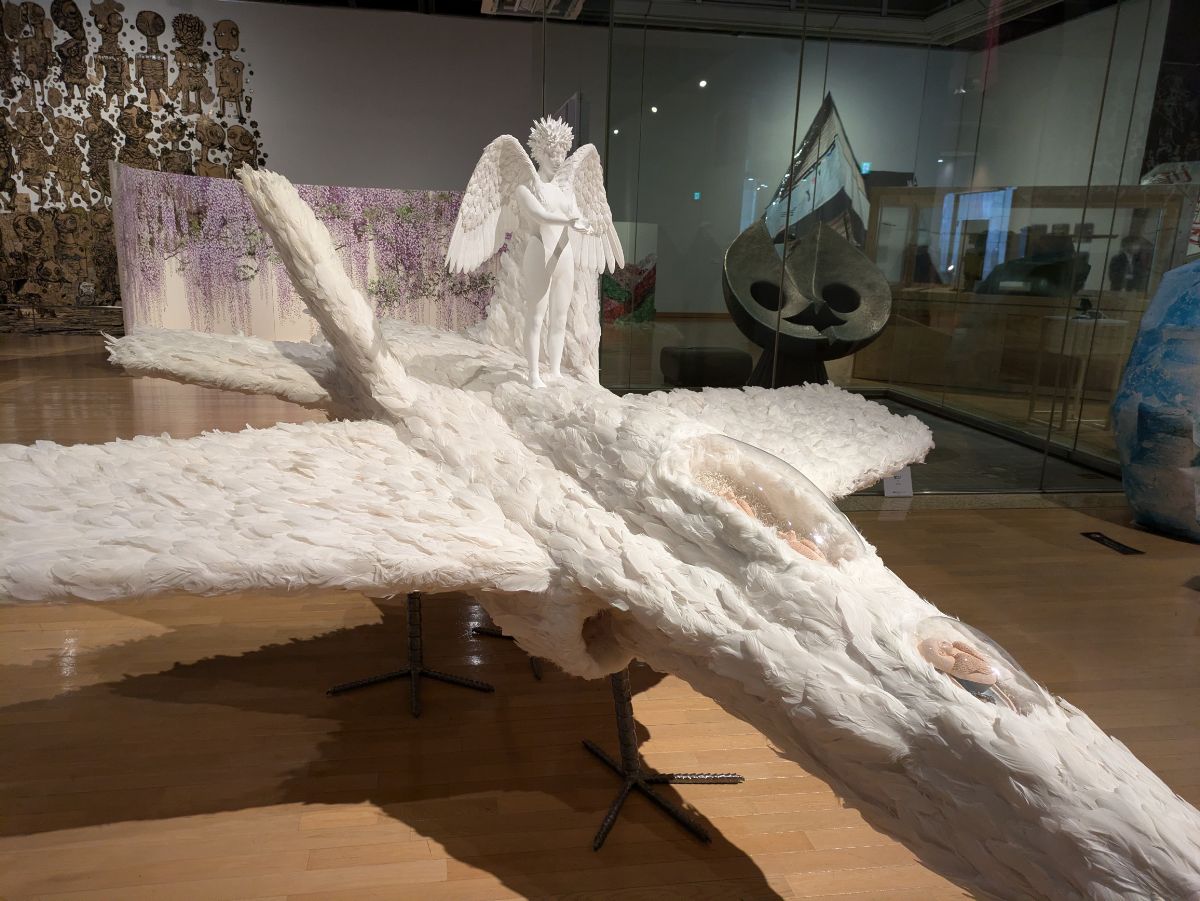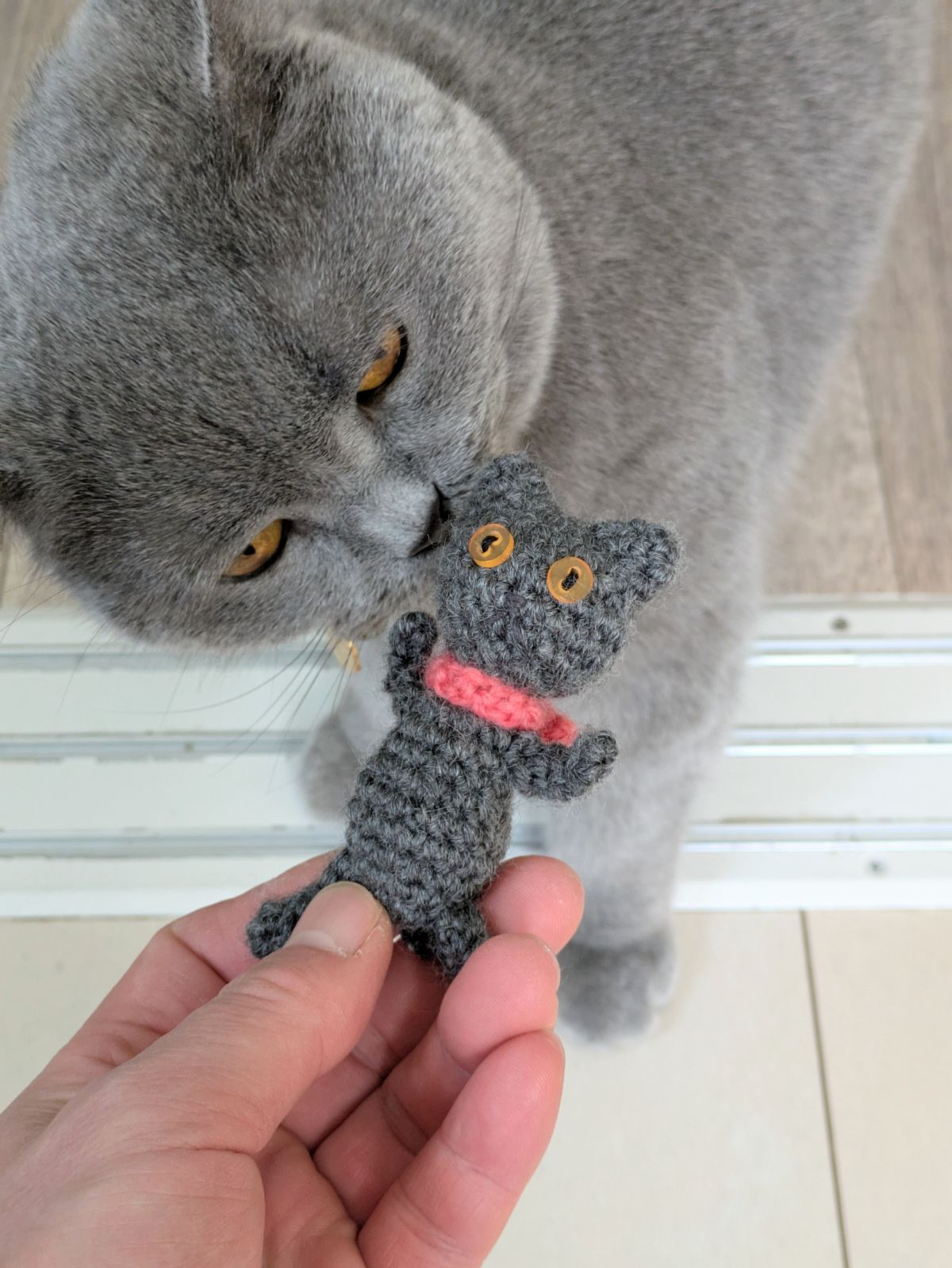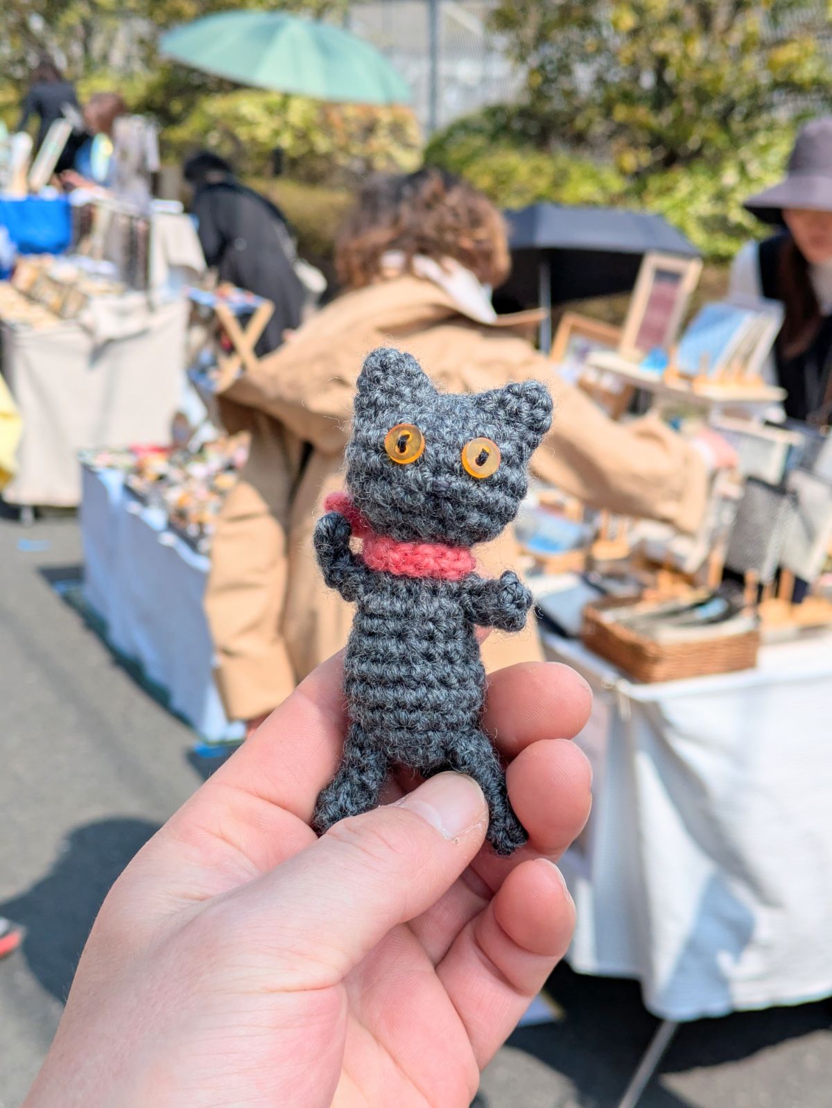 つくねのお土産はこちらの手編みぬいぐるみで、作家さんも猫と暮らしているせいなのかつくねめっちゃ匂い嗅いでました。中にマタタビとか入れられるとよいかもです(笑)。