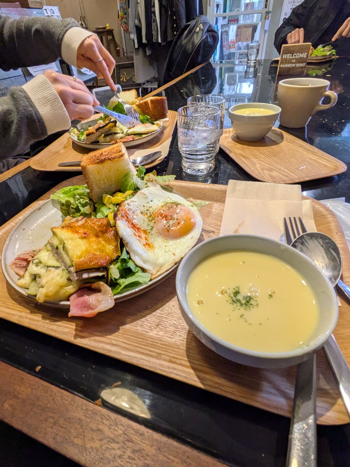 先週はズッキーニのプレートでしたが、今回はこちらのクロックマダムを頂きました。フワフワの焼き立てパンとホワイトソース、トロトロでたっぷりのチーズがボリューム満点です。レンコンの味付けもめっちゃ美味しい…!