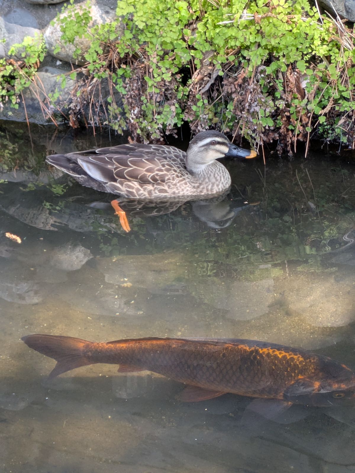 鴨や鯉も居ました。水面と距離が近いのがとても楽しい場所です。今みたいに綺麗に整備される前はよくザリガニ釣りをしに来ました(まあザリガニ採りなら今は無き光明寺池で四つ網するのが定番でした)。