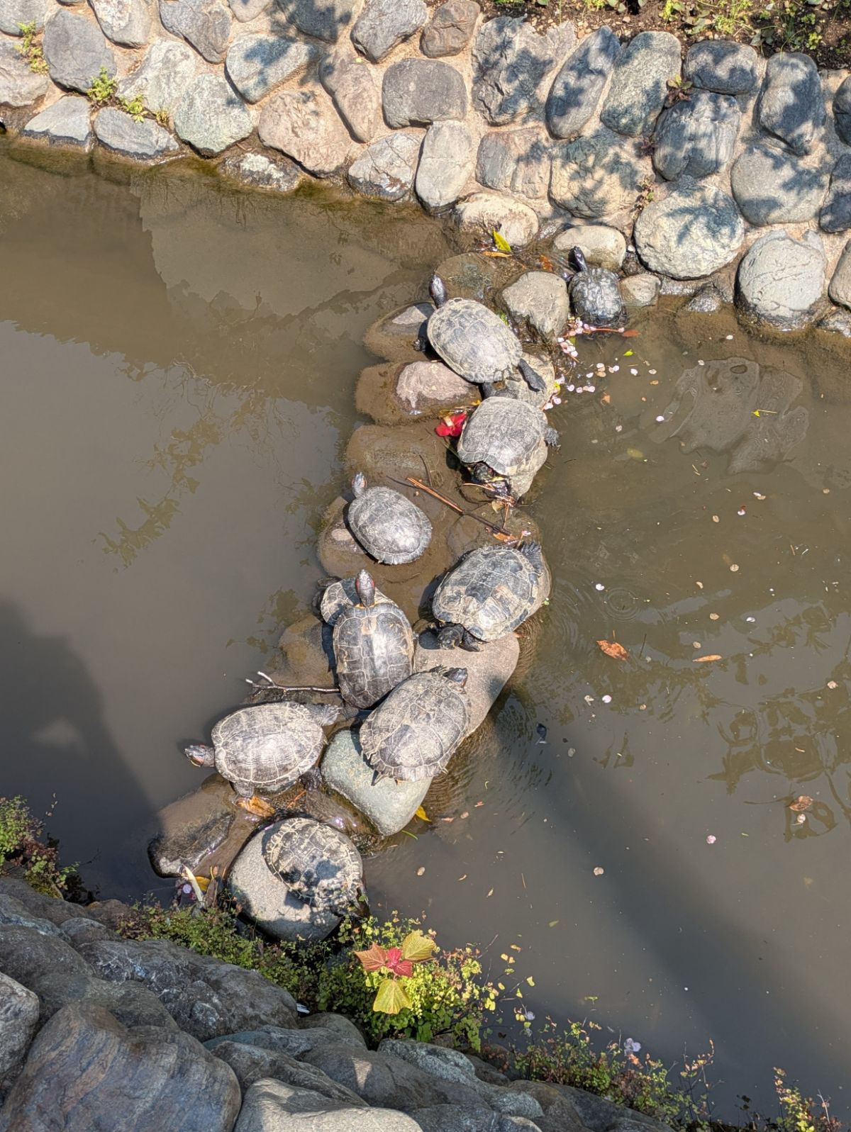 途中桜坂の麓にある水車の場所にはいつも亀が沢山いるのですが、この日はまるで橋を作っているかのような感じに!