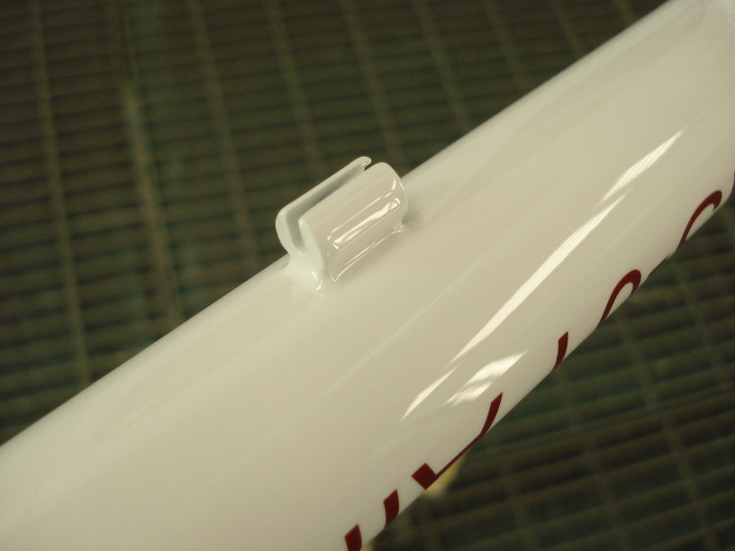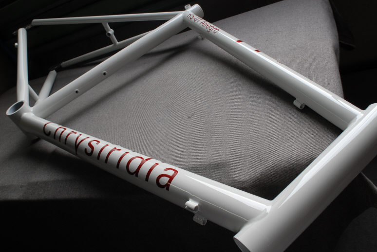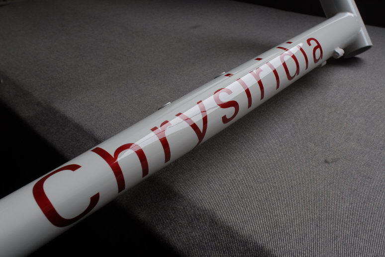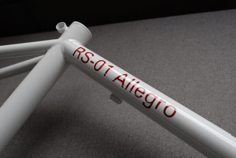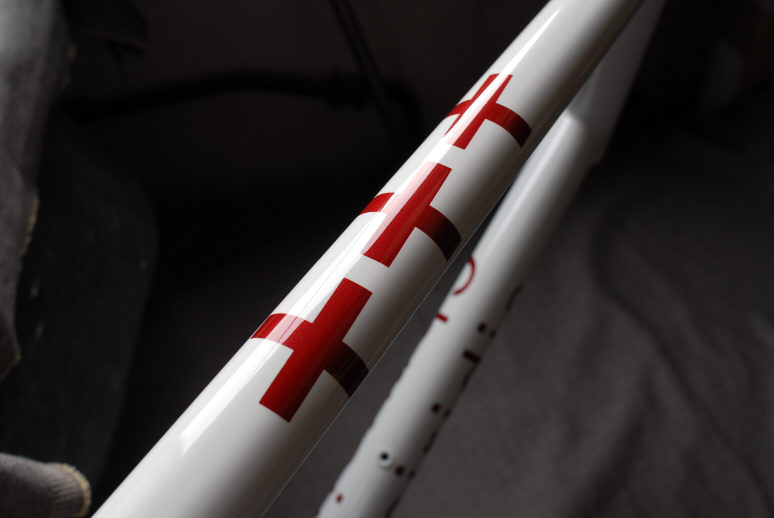 ![]() ダウンチューブには比較的大きめのロゴを入れています。 当初は「白ベースに赤パール」の配色はどうなのかと思っていましたが、出来上がったフレームを見てさすがデザイナーさんだと感じました。 |