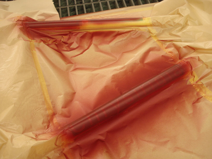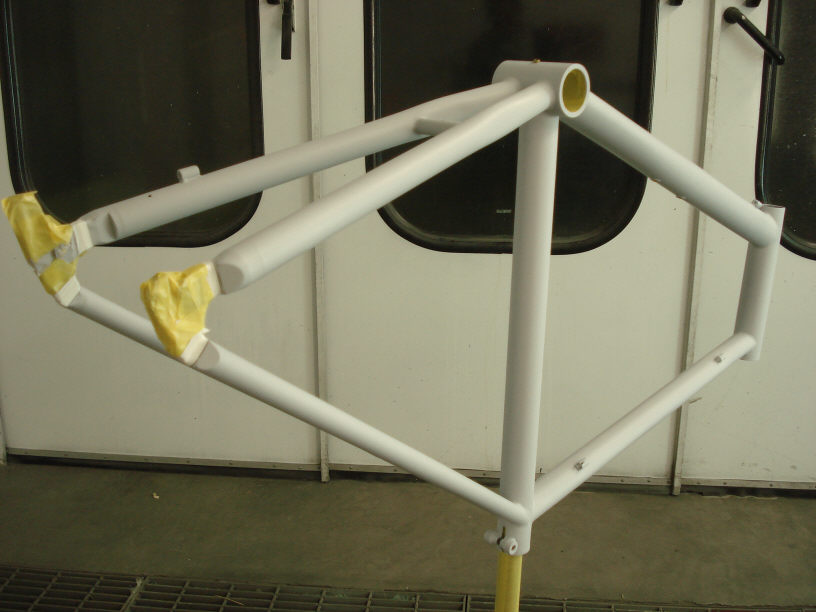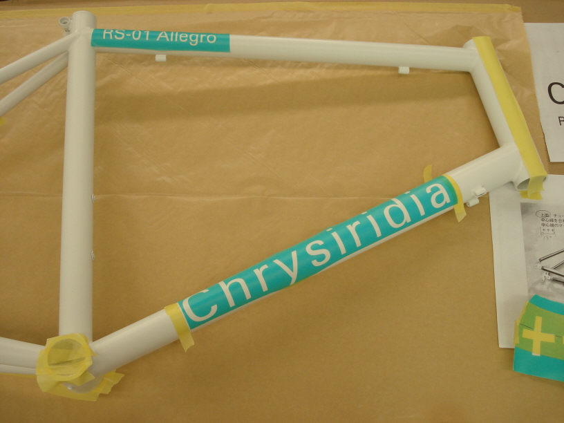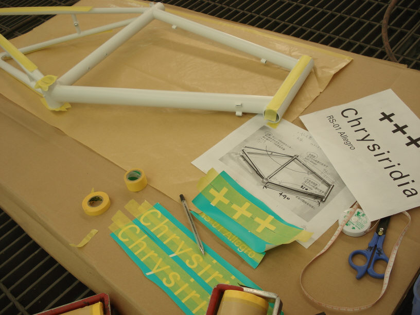 ![]() そしてベースコートのホワイトを塗布し、1時間程自然乾燥させてテープフリーな状態になったらロゴ入れ塗装の準備をします。 (画像ではちょっと解り難いですが、既にプライマーの上に「白」が塗られた状態になっています。) 下には綺麗な養生紙を敷き、さらにそれと接触するフレームの部位にはマスキングテープを貼っておきます。 予めクライアントから用意されたロゴデザインはカッティングプロッターでカットし、マスキングシートを作成しておきます。 尚、今回のようにロゴの位置などが厳密に指定される場合や、ロゴ入れが複数個になる場合には「お任せコース」では対応出来ません。 逆に「この辺に10cmくらいの白いロゴを適当に」と言った単純なご依頼であれば「お任せコース」でも対応可能です。コストを抑えたい場合にはお勧めです。 |