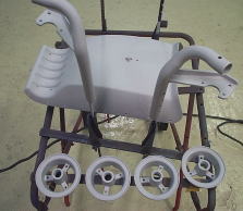 既製品でもブルーに塗装されていた電動車椅子だったのですが、素地(アルミ)への密着性が悪く、所々剥がれ掛かった状態で、オーナー様としても不愉快な想いに悩まされていました。