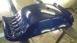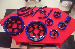 「折角なので」との事で、単色では無く、各部色別けをして斬新なデザインになるようにリメイクします。ホイールはアルミ製に新調して、漆黒とブルーメタリックの2トーンに仕上げます。