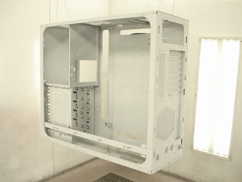 | パソコン内部のシャーシについてはこれ以上分解が出来ないのでこの複雑な形のままで塗装となります。 ただしこれをまともに塗ろうとすると外装パネル以上に作業は面倒になる為、今回はトータルのコストを抑える為に内部のマットブラックは「激安コース」で対応する事となりました。 激安コースはクリアーを塗らない仕上げになりますが、こういった普段見えない・触れない部分であれば大きな大丈夫かと思います。 |
