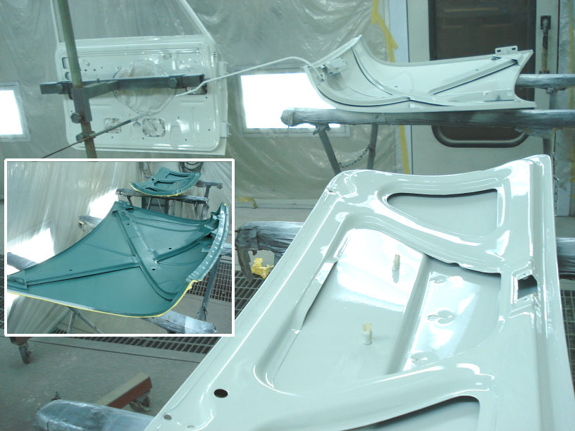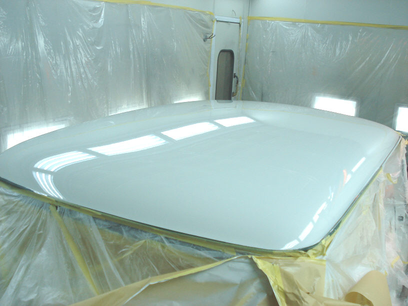 今回の御依頼ではルーフ(屋根)には縞模様が入らないので、ここはホワイトのみで先に仕上げておきます。 各パーツの裏吹きと同時に行うとゴミが増えてしまう恐れがある為、こちらは後日別工程として塗っています。これらは、裏吹き共にコミキの仕事です。仕上がりは私的にも綺麗に出来ていると感じます。