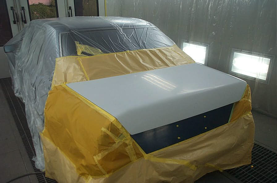 【1コート目】 フロントドアを一枚塗り終わってからリヤドア一枚を塗る。クリアーの繋ぎ目としては、ドア間の継ぎ目より若干ずらす。今回はリヤドア前方辺り。