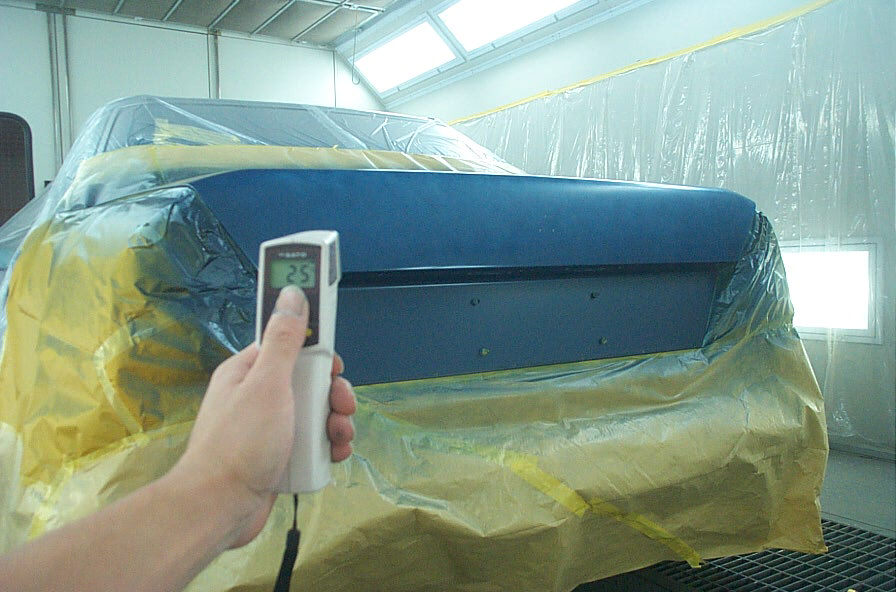 この「非接触温度計」はその名の通り、計りたい物質に触れる事なく温度を測れます。板金塗装業としてはあると非常に有り難いアイテムです。温度を計測する時に一緒にレーザービームが照射されるので、計る位置も解り易くて重宝します。ブースで焼く時(強制乾燥する時)であればブース自体の温度調整により使う必要は無いのですが、赤外線ヒーターなどで炙る(業界だとこう表現します)場合には適正な温度を掛ける必要があるのですが(炙り過ぎるとパテが剥がれたりします…ヒーターの場合は120℃くらい簡単にいきます…)、赤外線ヒーターの場合はその時の気温によって温度が相当変わるので注意が必要です。
