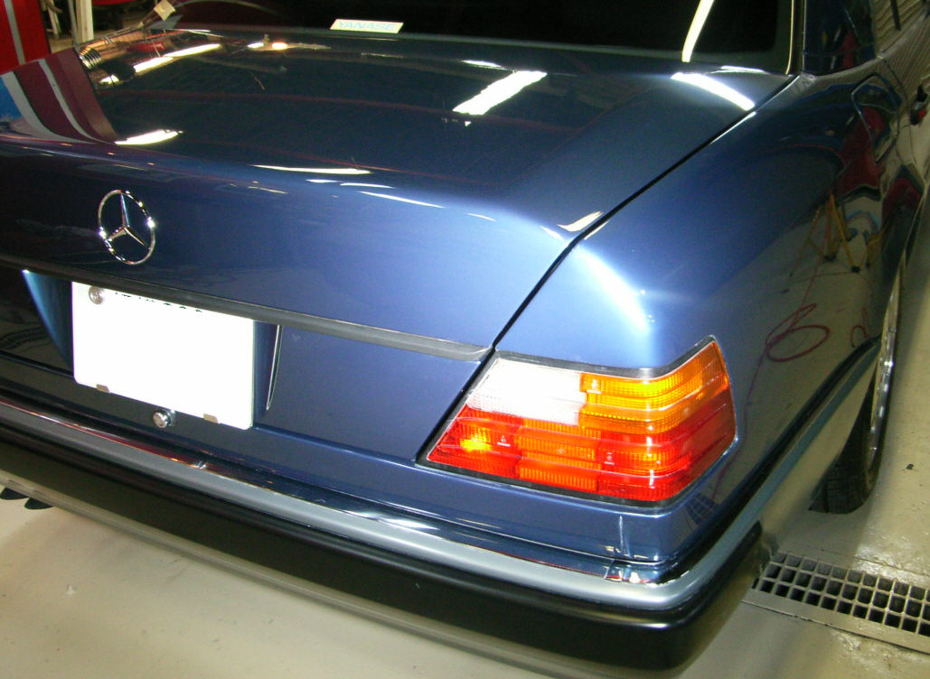 ちなみに今回はトランクを半開きにしてマスキングしていますが、この場合トランクルーム内の電灯が付きっぱなしになります。ロック部にスイッチが付いているタイプの車種では手動でロックを掛けてしまえばランプが消えますが、このメルセデスのタイプの様にスイッチがトランク側に付いている場合はロックを手動で掛けても消えません。このままだとバッテリーは上がってしまいます。このような場合は、ルームランプの電球を外すか、配線を外せば対応出来ます。今回はトランクトリム(内張り)を取り外しているのでランプのコネクターが簡単に外せるので後者を選択しています。 しかし中にはどうしても電球が消せないケースもあります(今はどのケースなのか思い出せませんが…)。その場合はバッテリー充電器を繋いでおきます。充電器は100Vの為常時電源が供給出来て、バッテリーに流す電流量も調整出来るので、電球が消費するだけの電流を流してあげれば過充電になる事はありません。 結構昔の車であれば「バッテリー端子を外してしまう」選択出来るのですが、最近の車両はバッテリーを外すだけで「警告ランプ」が消えなくなってしまい、キャンセラー(専用のコンピューター)を繋いで解除しなければならないケースが多いです(メーカーの策略かと…)。またナビゲーションやオーディオの設定も初期化してしまう恐れがあるので簡単にはバッテリーを外せません(バックアップ機能が付いている物も多くはありますが)。 ちなみに車体修理(板金)の際の溶接などの場合には、車両のコンピューターが壊れてしまう事を防止する為にバッテリーを外す必要性が出てくるのですが、外さなくても可能にする(PC破損を防ぐ)アイテム(工具)もあります。毎回バッテリーを外す手間を考えれば、万が一コンピューターを飛ばしてしまう事を考えれば必須アイテムだと思います(言うからには持ったりします…あからさまな紹介ですいません…)。
