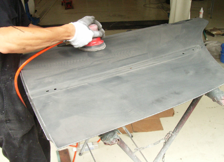 新品鋼板部品の場合の殆どは黒いプライマー(時々グレーがあります)が塗られてきます。熱硬化型のエポキシ系プライマーとの事です(以前調べた時はそうでした)。 一般的にはこの時点で#400〜#800くらいの研ぎを行い、いきなり上塗り(ベースコート&クリアーコート)をするのが普通ですが、それでは元の状態(新車塗膜)と大きくかけ離れてしまうので、私的にはここは昔ながらの方法で作業をします。詳しくは「当店基本作業詳細」のページのベンツのドア交換例に記載してありますのでここでは作業の流れを説明します。 画像はコミキ(従業員)による作業で、ダブルアクションサンダーで#240で表面を研磨しています。元々のプライマーが半艶の状態なので、研磨して艶がある箇所が無いように仕上げます。しかしパネルのエッジ部分は、鋼板を折り曲げた際に発生した歪みにより、通常のラインより一段高くなっています(見た目の違和感は無いです)。なのでその辺りはペーパーの当たりが良く、直ぐに鋼板が露出してしまいます。なのでこの作業(研磨)から裏吹きまでは連続した作業が必要になります。鋼板が露出したまま放置すれば酸化して(錆びて)後のブリスターの原因等になります。