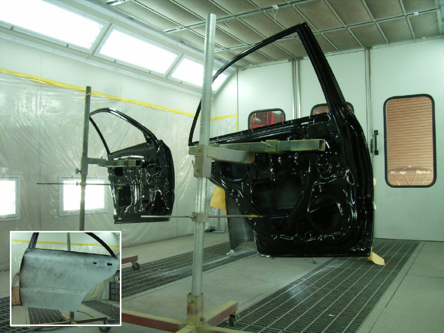 表側の鋼板が露出した箇所にはウォッシュプライマーを塗布し、全体にはプライマーサフェーサーを塗布します。裏も同様です。 この後、このプライマーサフェーサーは研磨(水研ぎ#600→#800→#1200)して平滑にする為、少しでも研ぎ易くする為に塗面が荒れないように注意します。通常2コートで終わる膜厚分を、溶剤で希釈して薄い膜厚にし、それを4コートに増やして対応します。最終的な膜厚は変わりませんが、この方が肌が荒れ難くなります(「肌」=「艶」ではありません) その後続けてドアの裏側にベースコート(黒)を塗り、クリアーを塗ります。そして焼きます(強制乾燥させます)。