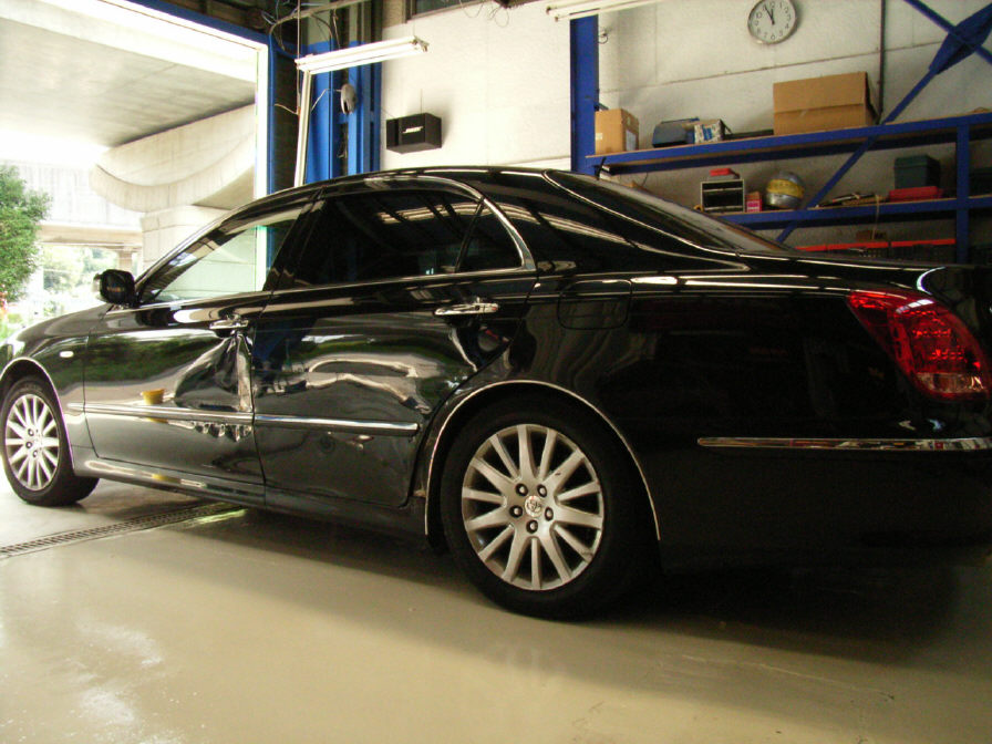 ドアパネル二枚は交換なので外します。本日新品ドアの裏吹きが完了しておりますので、明日取り付け致します。 ちなみに当店で言う裏吹きとは、表にサフェーサー、裏側は本塗りを完了させる作業を指します。こちらは別枠で紹介させて頂きます。 ちなみに本日知り合いの業者さんが来て教えて頂いたのですが、マジェスタ、600万円くらいするらしいですね・・・。「レクサス」なる別枠が出来た結果、トヨタのトップブランドとしてさらに高級化したとの事らしいです。オーナー様から、今まで3台維持して来たのをこの一台に集約したとの事を伺いましたが、ようやくその意味の深さが解りました。無知ですいませんでした…。