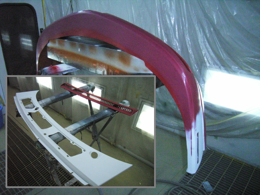 フロントカウルパネルはボディより取り外した所、淵部分に錆が若干見られたのでこちらも処理します。劣化の酷かった部分の塗膜(部分的な塗装暦)も剥離し、結果全体的にサフェーサーの塗布となりました。ダクト部分の部位は特に損傷はありませんでしたが、色を合わせる為に「ボカシパネル」として、こちらも一枚塗ってしまう必要があります。