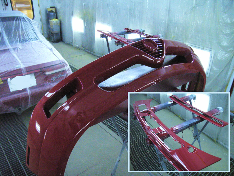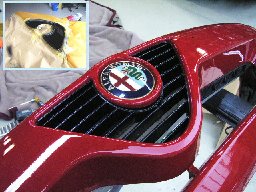 ボディの赤が塗り終わり、強制乾燥完全硬化後にエンブレム周りの艶消し黒を塗ります。その前に勿論下地処理はしておきます。 バンパーの一部分ですが、この黒い部分によってボディ全体のイメージが引き締まります。 アルファのエンブレムも装着し、イタリアンなデザインの完成です。